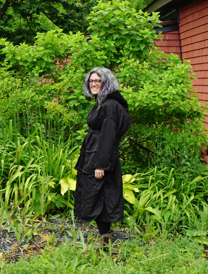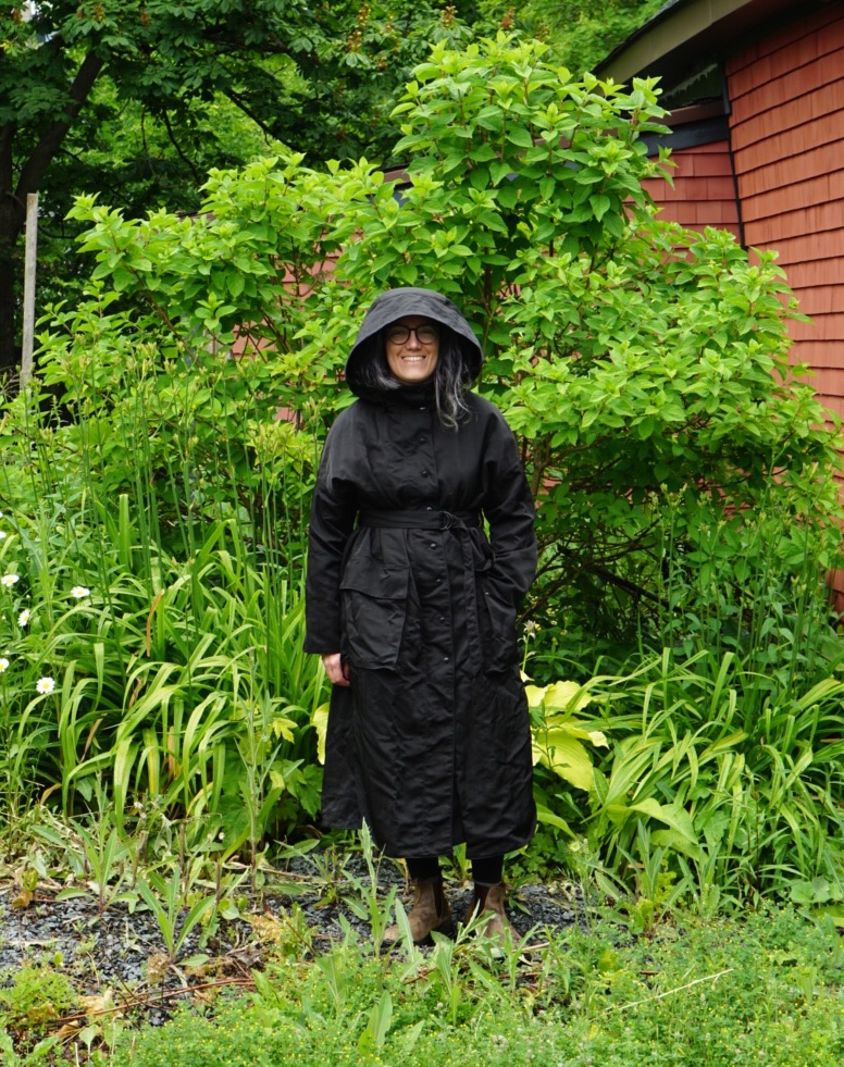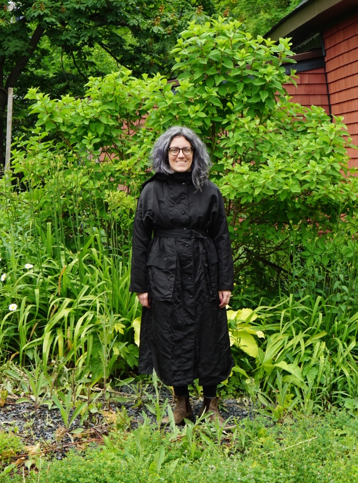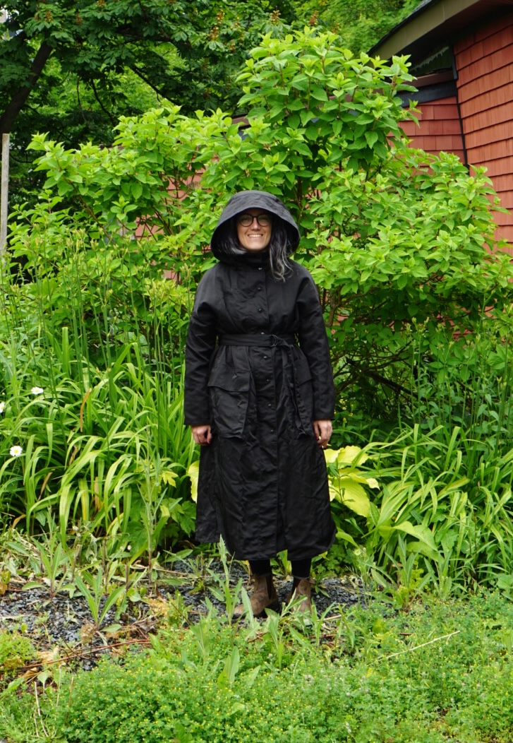 If you got this far, thank you for being along for my giant complain-fest. I promise I’m done. I just needed to vent! Even experienced sewists can make bad decisions regarding fabric and pattern combinations, and do stupid things because they thought they were too experienced to do something like *read the instructions*. I will say that the fabric and pattern combo made the garment terrible to sew, but I am very pleased with how the actual garment turned out. I wore it on a damp day on a walk to a nearby farmers’ market, and it did well at keeping me dry. It’s obviously not as waterproof as my intense raincoat with taped seams and a waterproofed zipper and fancy technical fabric, especially since I had to topstitch a lot more than the pattern even called for. But I’m very pleased. It fulfills the exact function I had in mind when I came up with the plan, it fits well, and I love all of the details of the pattern. I would love to sew it again some day in a fabric that doesn’t actively conspire against me at every possible turn, and also sew it with the lining hem hanging free as intended. I feel like an ominous Carmen Sandiego in the best possible way when I wear it. I’m excited to wear it with my black concert clothing to an orchestra performance so I can feel like a character in an ominous futuristic movie, emerging from a fog or some shadowy alley. I’m very intrigued by a lot of the other Grasser designs and may try them in future, however for now I see a lot of simple knit garments in my immediate future. I need some quick wins!