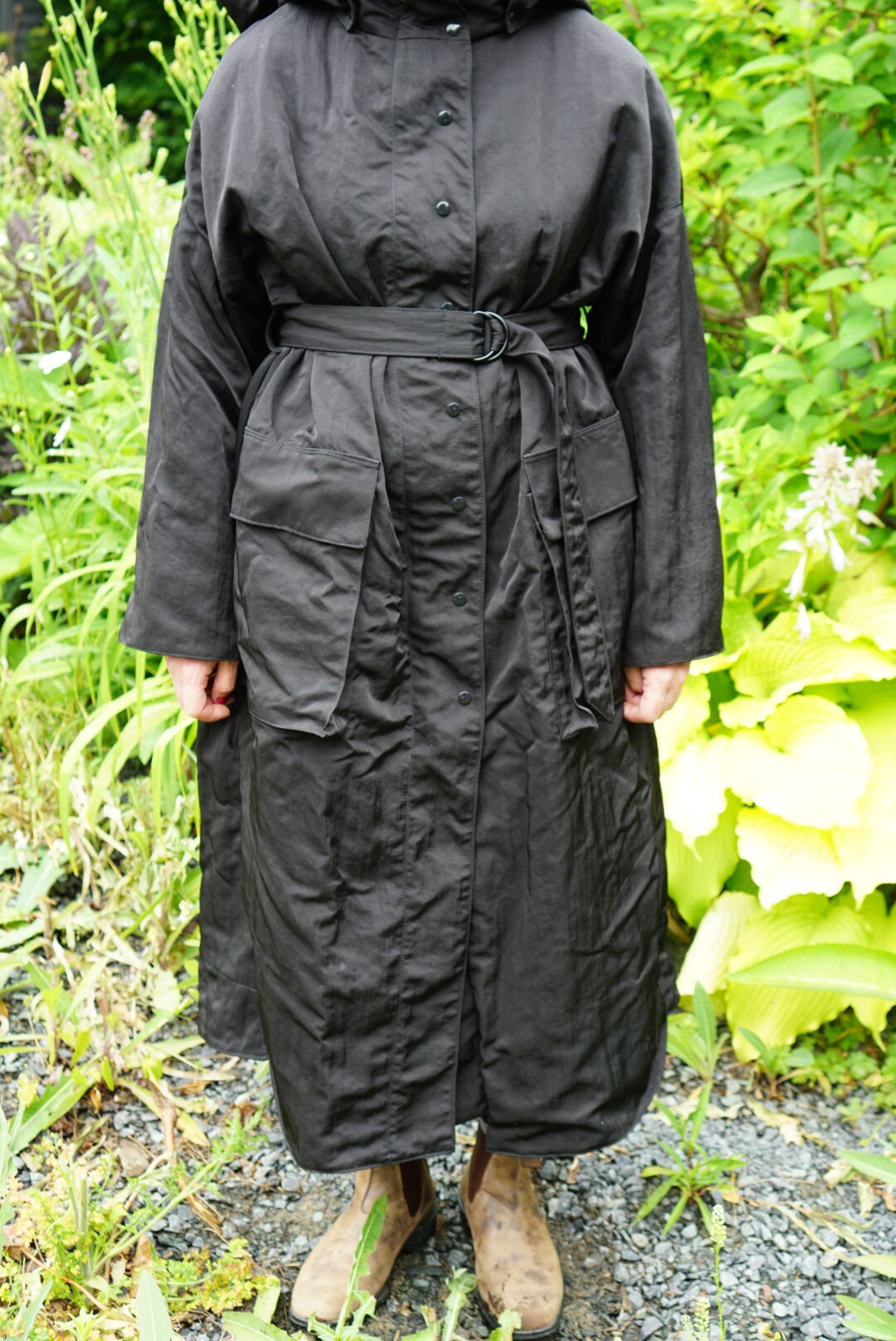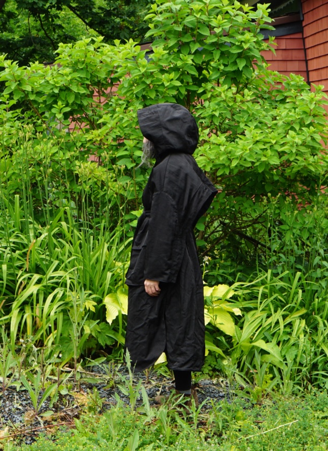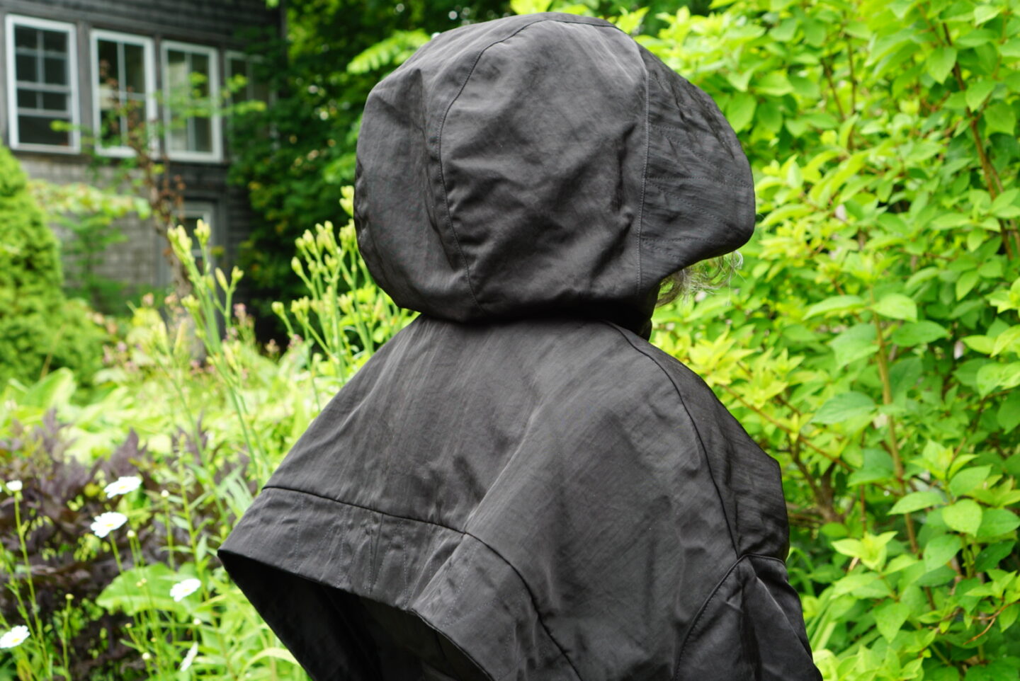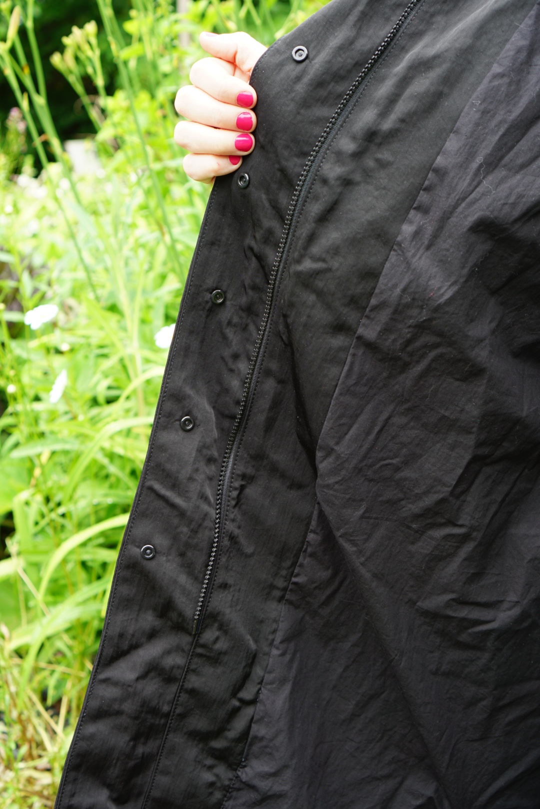 In terms of the sewing process, what made this project especially annoying to sew was that at all times the nylon was trying to slither away to the ground. Gravity was not my friend during the making of this raincoat. Because of the weight of the coat, literally every time I sewed a seam, I had to keep repeatedly yanking the garment back onto my lap. When I was pressing seams or pinning things, it kept falling on the ground. I cannot overstate how much time I spent preventing the fabric from sliding onto the floor. It became a comedy act, with me muttering, “Come back!”, “Stop that!”, “Stay HERE!”, “Stop SLITHERING!”, “Oh yes, I did want you to be on the ground, how did you know?” and “Nooooooooooo!” while sighing heavily, and my partner saying, “Isn’t sewing FUN!”, “I can sense that you are having a great time with your hobby.” Honestly, I consider it a huge victory that this project got finished and didn’t end up stuffed somewhere out of sight or dumped in the garbage.