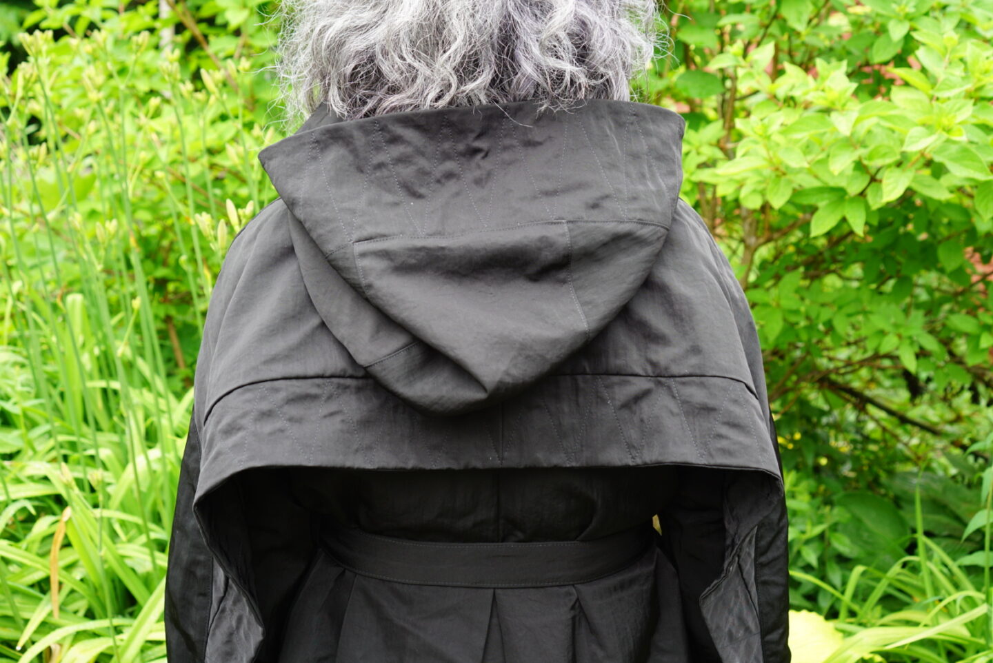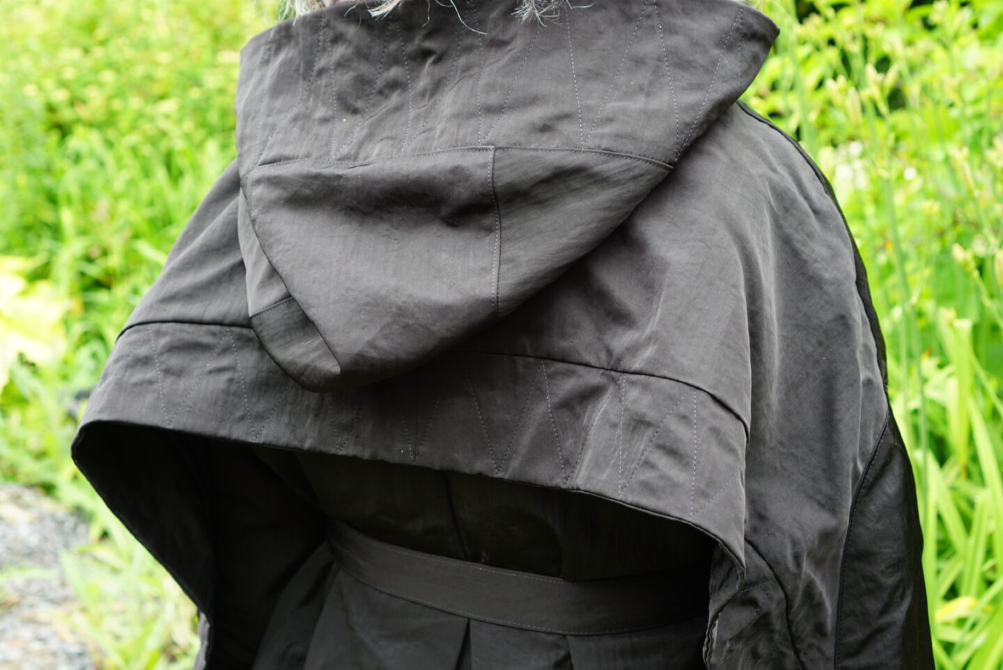 Let us start at the beginning of this story. Either for Christmas or for my birthday in April (I can’t remember), I received a gift certificate to Blackbird Fabrics from my mum. An excellent gift! I was occasionally perusing the Blackbird website because there was nothing I specifically needed but was open to inspiration if I saw something I loved. I eventually stumbled across their water resistant nylon twill. It’s not on their website anymore, but it’s 100% nylon and 56″ wide. It made me think of a desire I’d had in the back of my head to make a raincoat that was for ~fashun~ and not just for function. I have an extremely waterproof outdoorsy raincoat, but I’d always loved images of a dramatic calf length raincoat that could give a fancier touch to an outfit when the weather was wet. I found the Grasser patterns when searching for raincoats, and chose the Grasser raincoat 908. I’d never sewn anything by Grasser before, but I loved the aesthetic of a lot of their patterns. They sell patterns (or at least this one) in single sizes and heights, and I chose the size 48 in height range 158-164cm. I’m 5’4″ and my measurements are 38,5″/30.5″/39″, for reference. To align with my vision, I went with the black nylon twill. I ordered 5m of it, along with 2.5m of Blackbird’s washed cotton poplin, also in black.