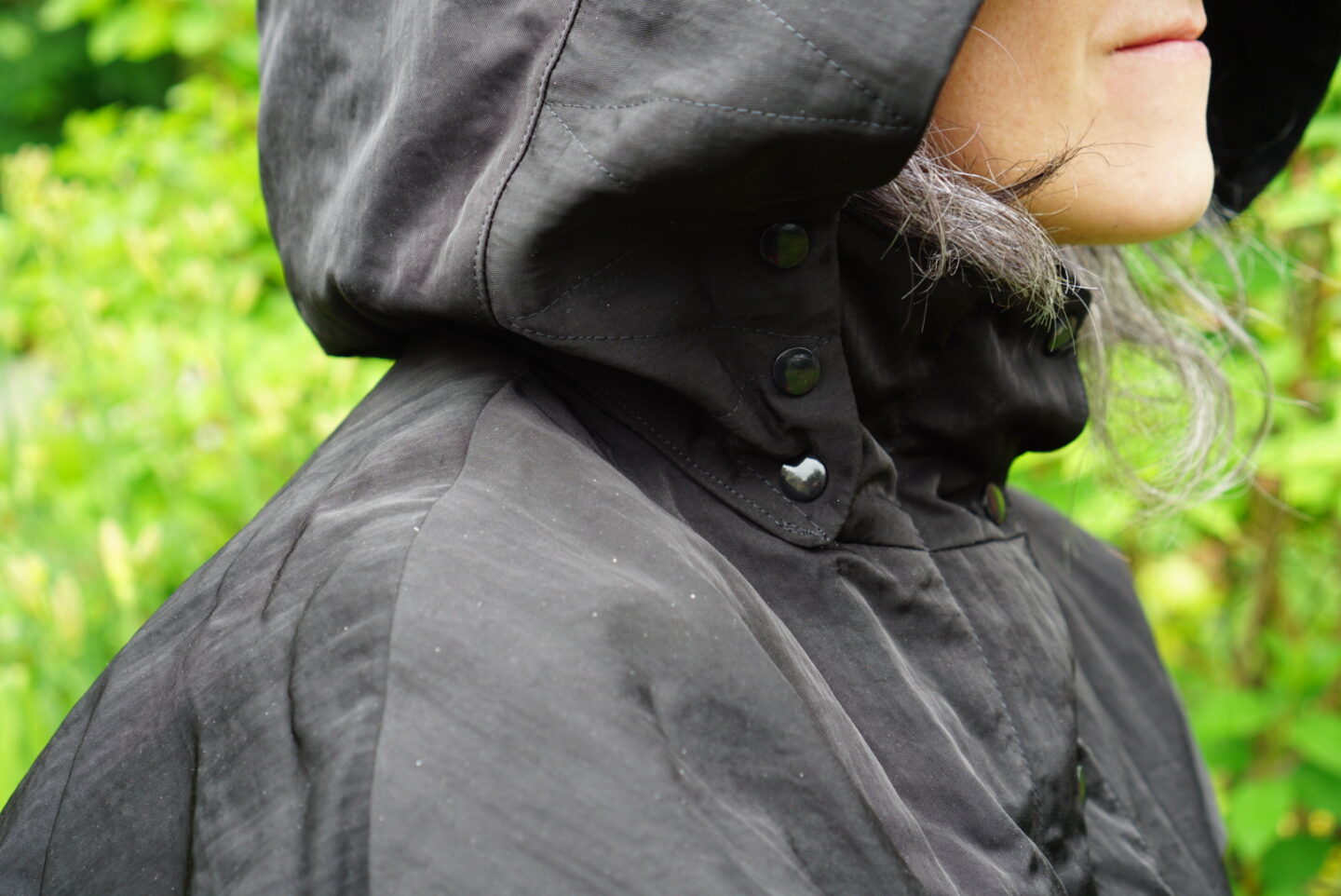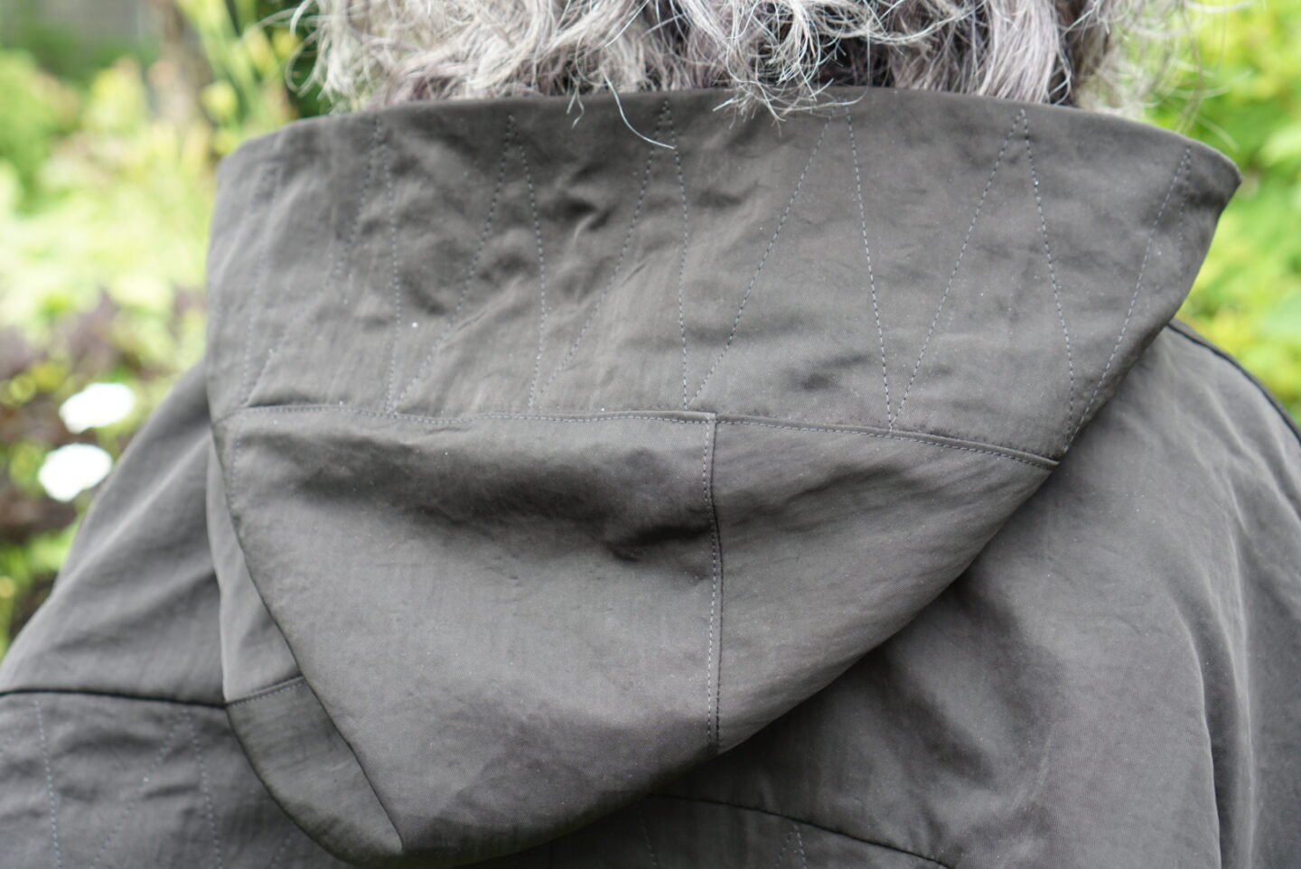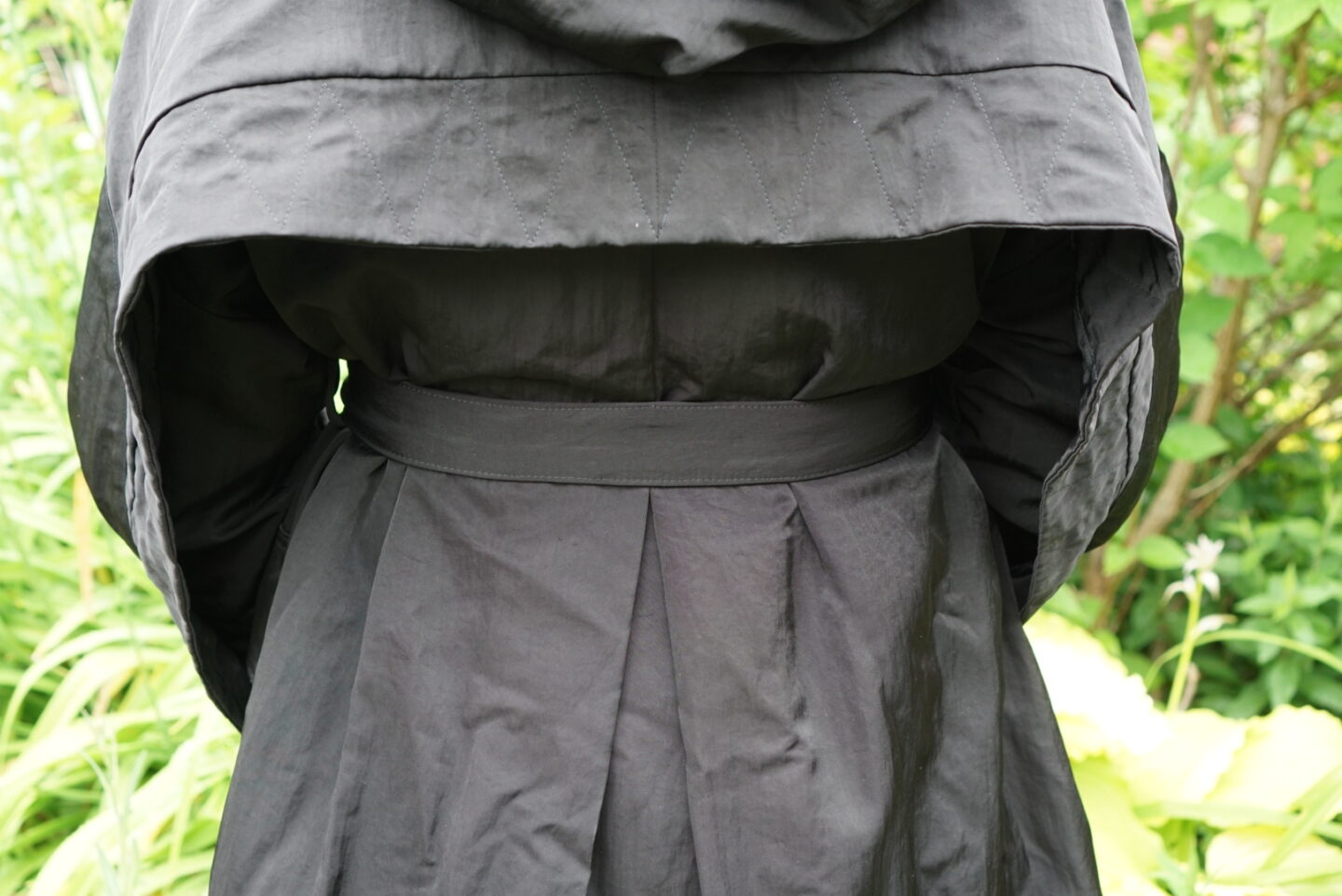 Something else that was an obstacle with this project was the pattern itself. The pattern is originally published in Russian (I believe), but Grasser also offers other languages, including English. I haven’t checked into this, but I’m pretty sure that the patterns are not professionally translated based on my experience. I found there were quite a few words that weren’t really the usual English word for a particular sewing thing, which made things tricky and took a lot more brain power to get through. The pattern also features photos instead of line drawings, which is not my preference. I kept having to refer back to the PDF on my iPad because I prefer my instructions to be printed, but the black and white was making it hard to see details in some of the photos. I am not laying all of the responsibility for the issues I had at the feet of the pattern, but I did find at least one place where the pattern steps seemed to be out of order in terms of understitching/topstitching in a way that prevented the next step from occurring correctly. I had to unpick the stitching in order to get things in order, and I think that incident in combination with the brain power I was having to expend sorting through the photographs and the translation things caused me to lose trust in the pattern. This raincoat pattern is rated as Grasser’s highest difficulty, and I do not recommend it for the faint of heart. If I did not have extensive sewing experience, and lots of experience with coats in particular, I think there would’ve been many points that derailed me. In terms of the construction and design, I think this raincoat is extremely well done. I love the styling and the details and it fits really well. It was great not to have to adjust for my height, especially with the amount of pattern pieces going on! One detail in particular that I love (outside of the storm flap I mentioned above) is that the back pleat perfectly meets at the location of the waist belt. It’s so satisfying!