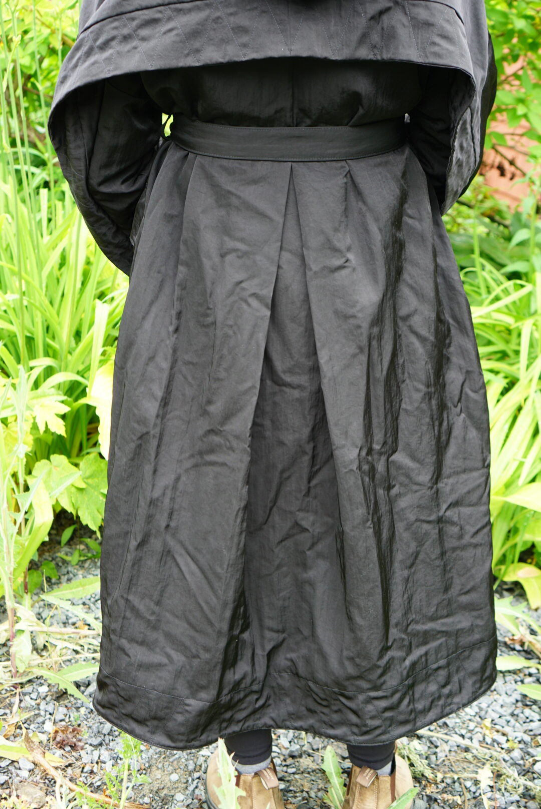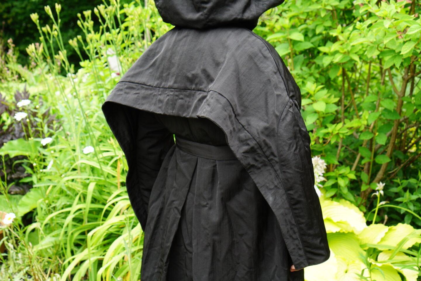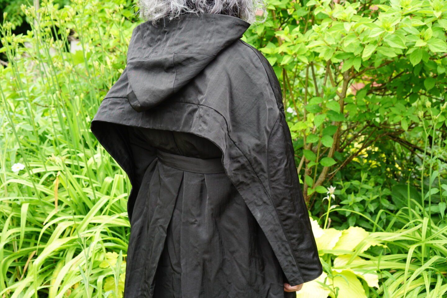 I explained all of this to my partner and showed him everything. He didn’t fully understand, but he asked the correct question. He asked me, “If you don’t go back and try to overlock everything on the inside, what would you do instead?” I honestly could not see any solution to this issue, but being asked that question forced me to try to think about it more seriously, because if I didn’t have an alternate solution, I was going to have to do the afterthought overlocking. But I came up with something else, which was only possible because of how the huge pleats are constructed and because I still had some of the cotton poplin left. I will tell you about it once you’ve taken a look at the photos below. Specifically, I want you to take a closer look at the back view and the fact that there is a center back seam on the upper portion of the coat.