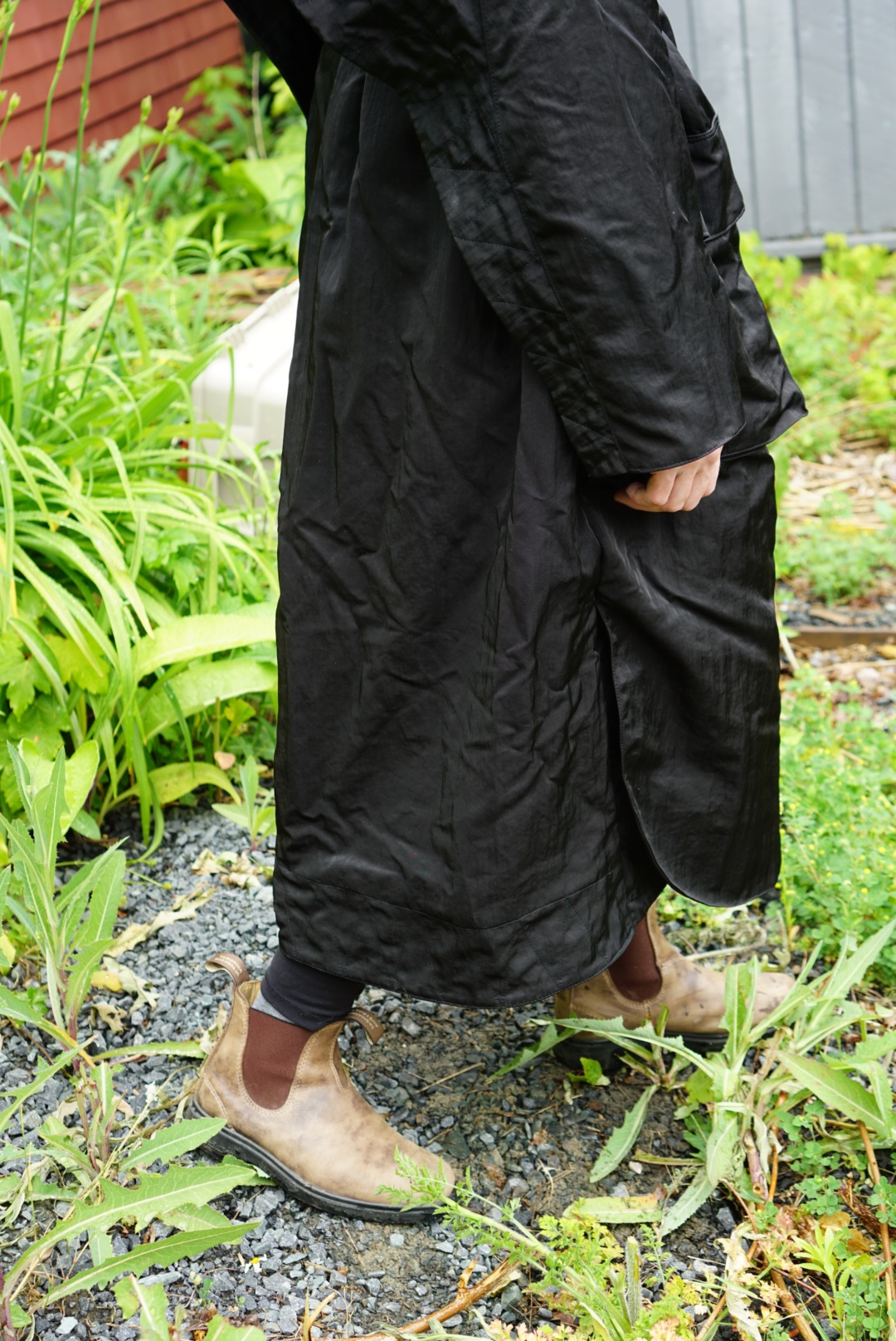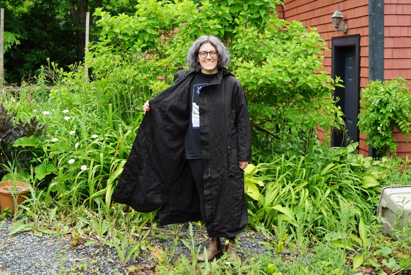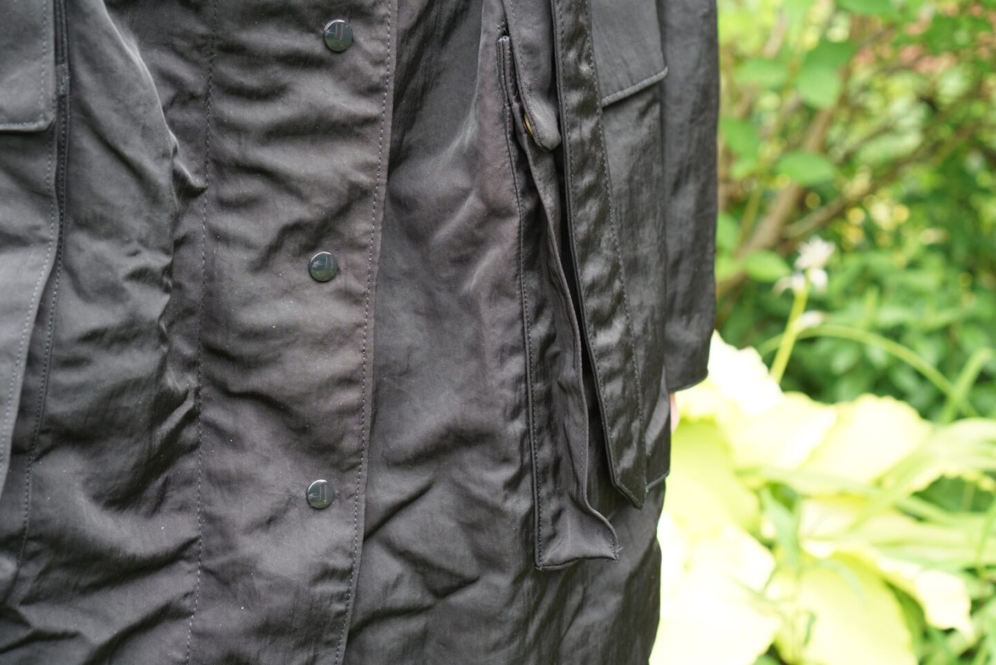 The fabric arrived, and I loved the look of it. The nylon had this lovely sheen and weight, and I loved that it was twill. It really felt elevated. I was feeling fancy, feeling excited to tackle a complicated sewing project. I printed out the PDF pattern and started assembling it. It took so long because there are so many pieces. The pattern pieces are not labeled with the pattern piece numbers, just the name of the piece. The lining and the main fabric pieces were split into two PDFs, which was fine. It was just a lot to keep track of. Then, in the pattern instructions, when referring to different pieces, there was a mixture of using the name of the pattern piece and using the pattern piece number. I ended up having to label all of the pattern pieces with their numbers in order to keep things clear, because things were getting very confusing in the interfacing stage without them. After that, I got to the fabric cutting stage. Let’s pause for a brief photo break to remind ourselves (me included) of the fact that garment turned out great! Yay!