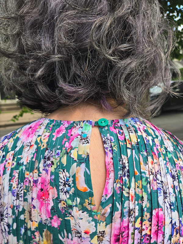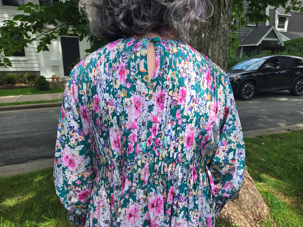 Something I learned from this pattern is that when you are sewing something with pintucks, it’s normal for the pattern pieces to be cut out with a buffer all around them. This is because it’s very easy and I think very normal for pintucks to introduce inaccuracy in the sewing. The fabric might shift a bit, you might not always be sewing exactly at the narrow seam allowance, and if you are off by 1mm on every pintuck, that gets amplified very quickly! But when you cut the fabric out with a buffer (which the instructions explain nicely), you can sew the pintucks and then use the templates to cut it to the correct finished size and shape afterward. This was such a weight lifted from my mind, because I thought that I would have to be so focussed on that for the whole process in order to avoid weird fit issues. And it’s not that I was sewing sloppily, but having that room for error is necessary and helpful! The biggest thing I learned from sewing the previous version and from sewing this one is that it might seem like you’ve sewn a few pintucks in a bit of a wonky line, but when you step back, it’s not noticeable at all and everything looks satisfying and neat. Especially once you’ve pressed it all flat! This pattern also includes a blouse version (and a V-neck option) so if you want to try out pintucks without using so much fabric, that’s a good option and even more so if you went with the sleeveless version.