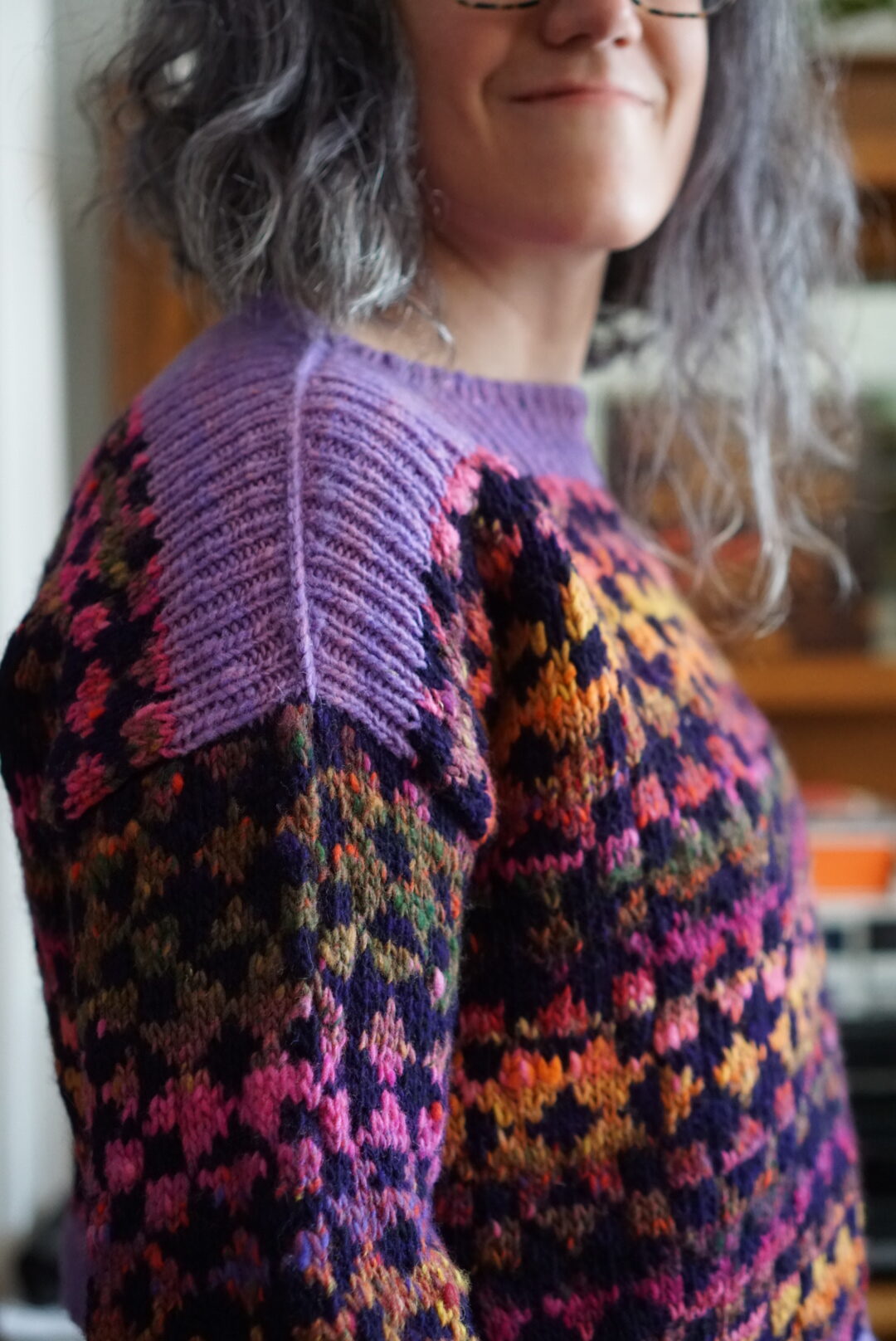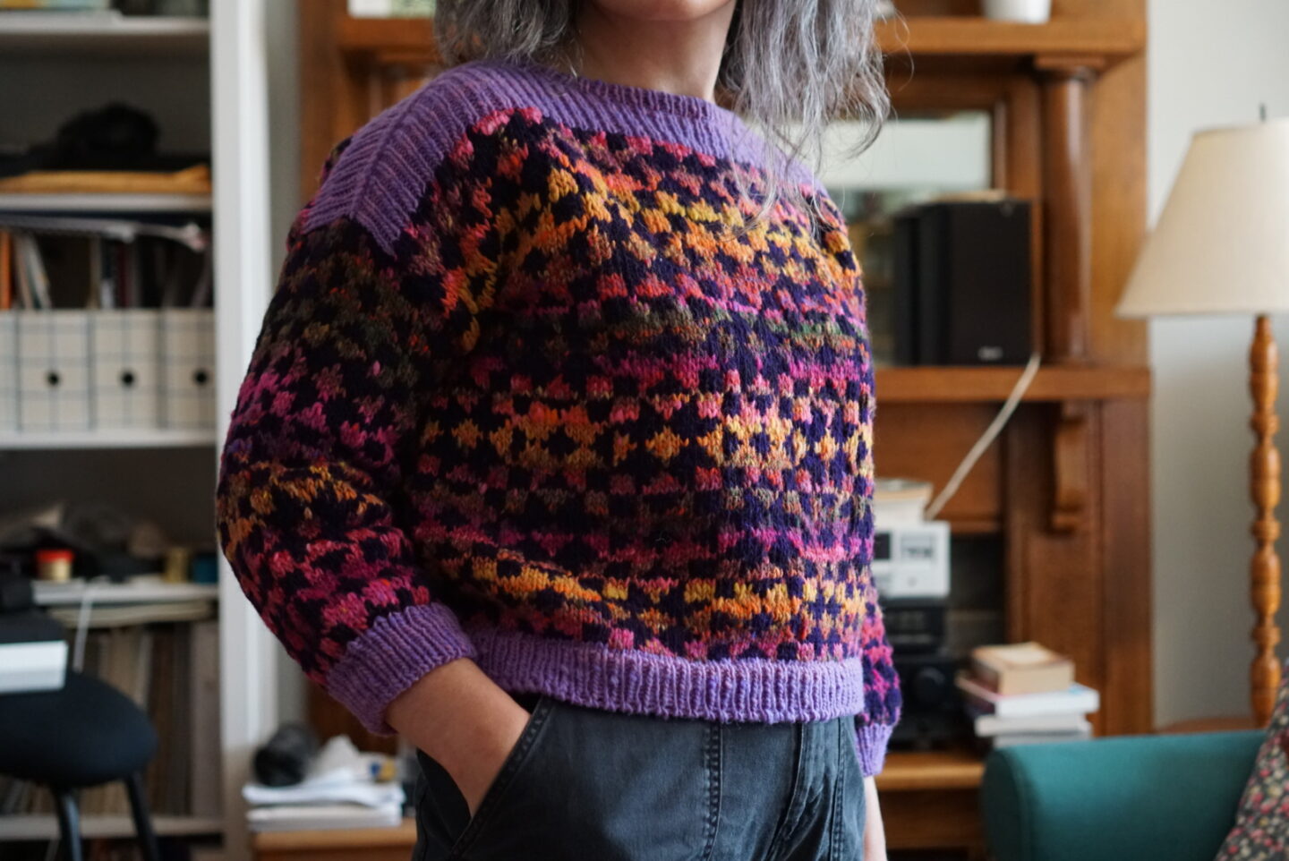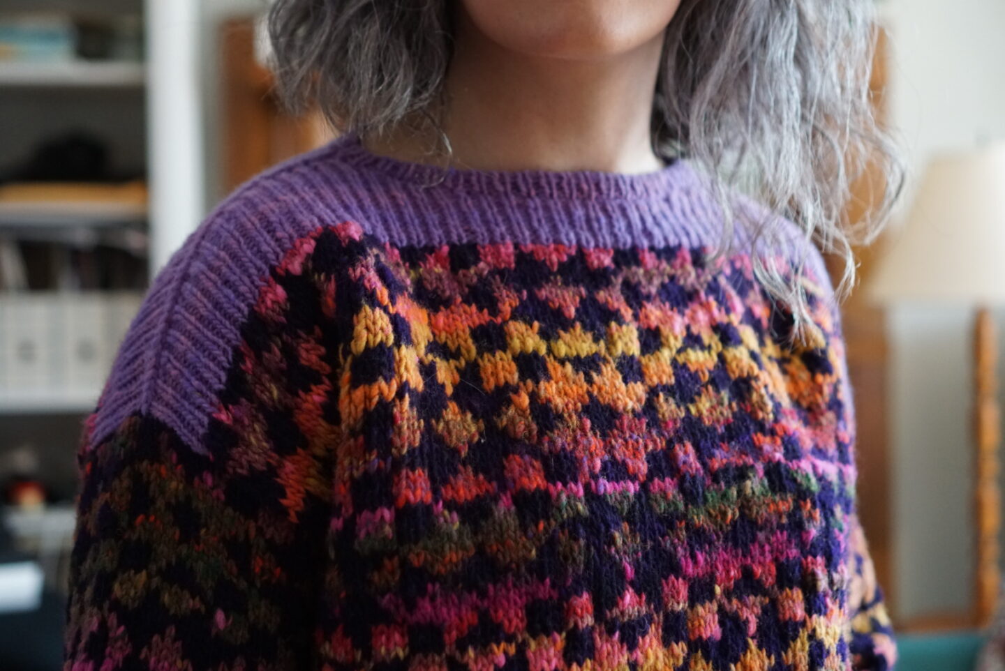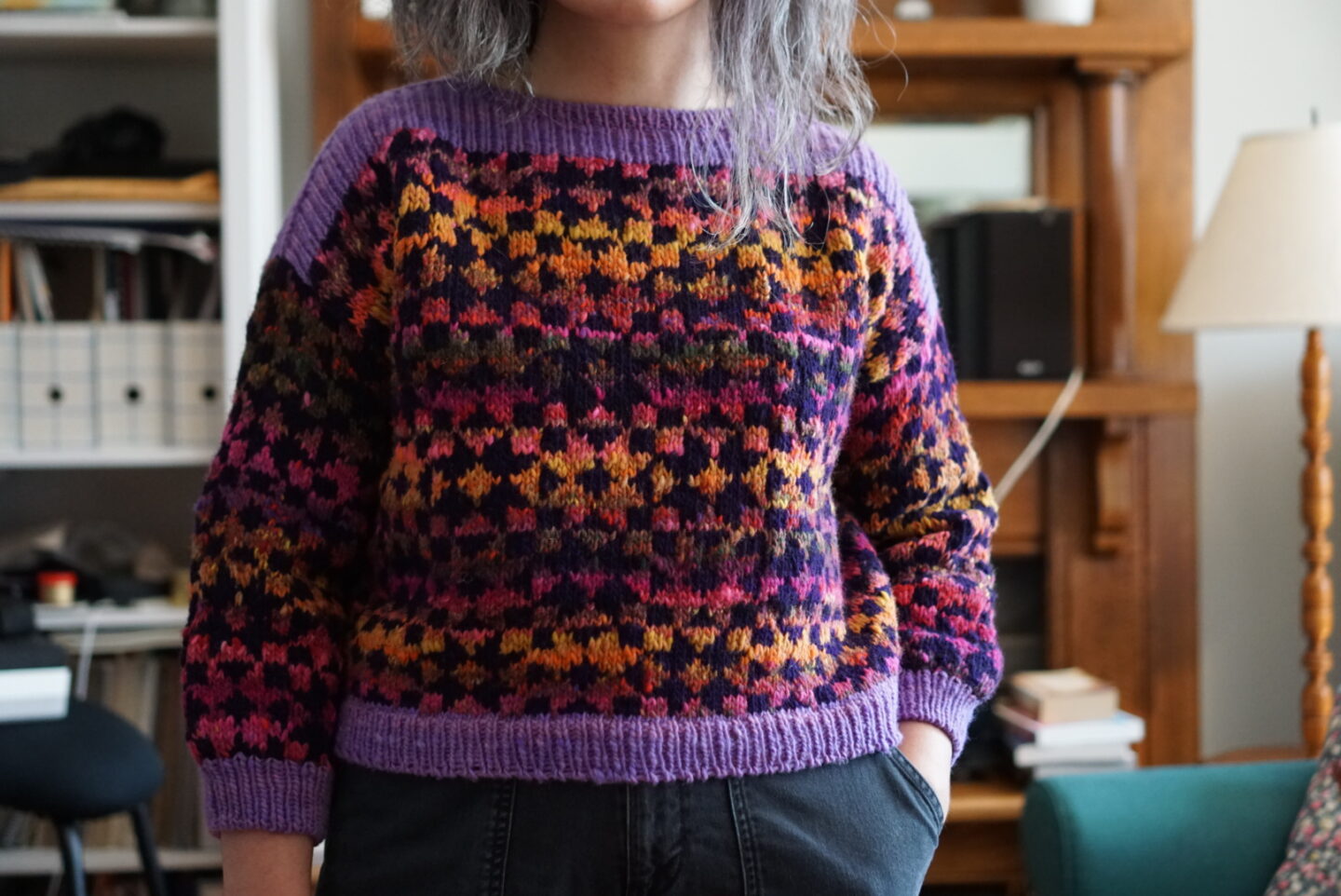 In terms of the actual knitting, the Framed sweater is knit bottom up and after you split for the armholes, you have to do colourwork knit flat for a bit. I’d never knit a bottom up sweater, and I’d never done colourwork not in the round, so I got to learn new things. Bottom up sweater make me wary because I have a short torso and prefer my sweaters a bit short in the first place. I usually try sweaters on quite a few times as I’m knitting them in order to make sure I get the perfect length. Not being able to (easily) change the length after the sweater was mostly finished is not my favourite. With this sweater, since it has the colourwork block motif, you’re also limited in how much you can shorten or lengthen it without cutting a block in half horizontally. I ended up just knitting the amount of repeats suggested by the pattern, and it worked out fine! My gauge was a bit off, so I knit size 2 and then it came out as size 3, which is the one I actually wanted in terms of measurements. This is very typical for me, and at this point I’m used to knitting a combo of one size in circumference and another size in length. The three needle bind-off on the shoulders was a new technique to me, and the pattern has you do it with the seam on the outside. I really enjoyed the technique and I like how it looks as an added design detail!