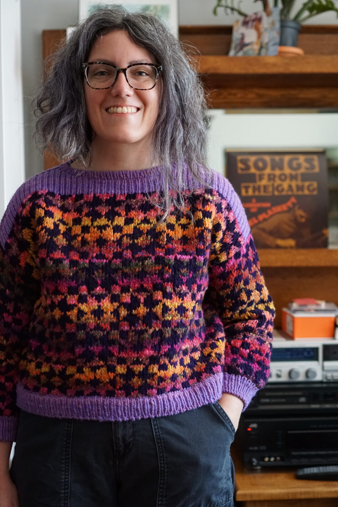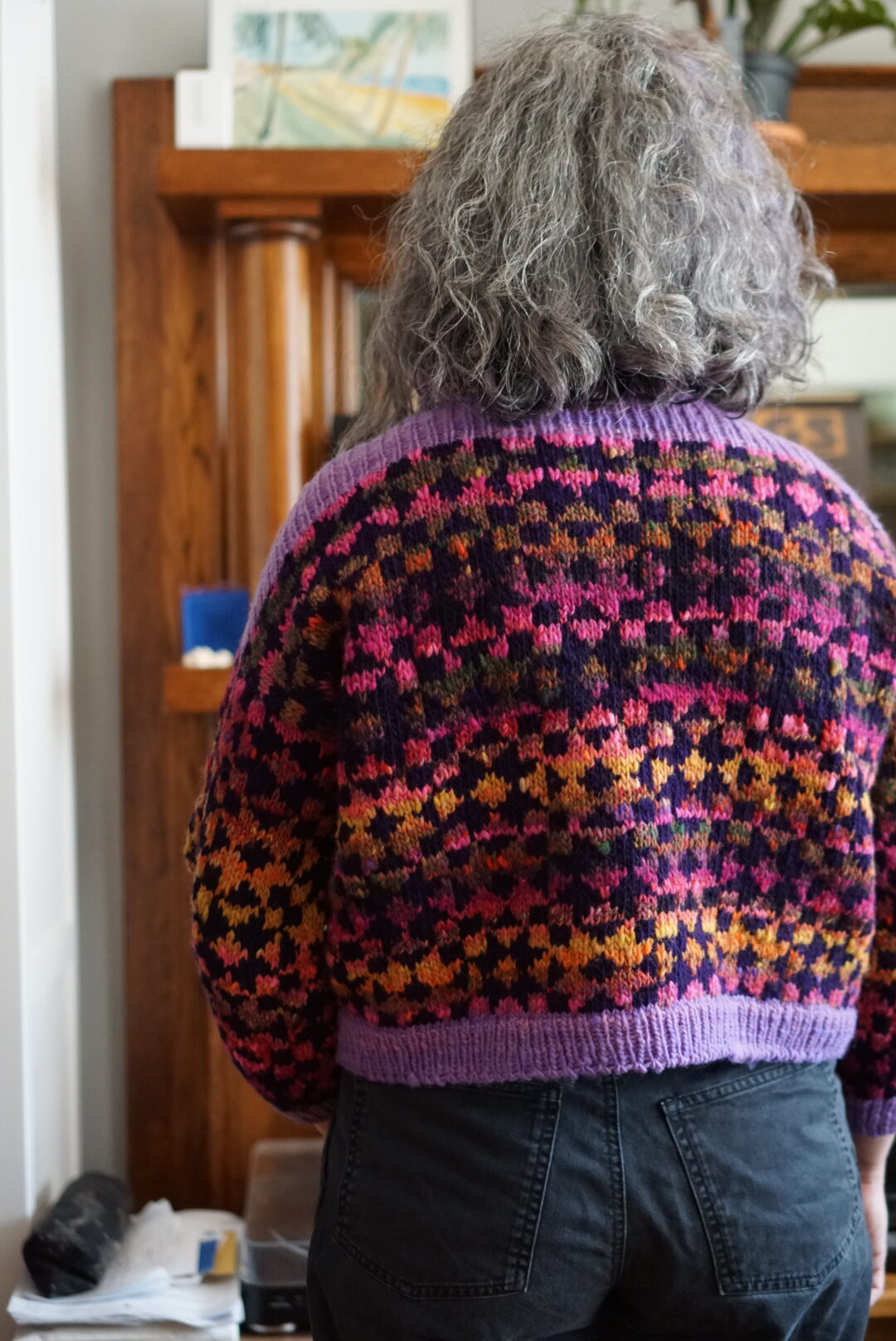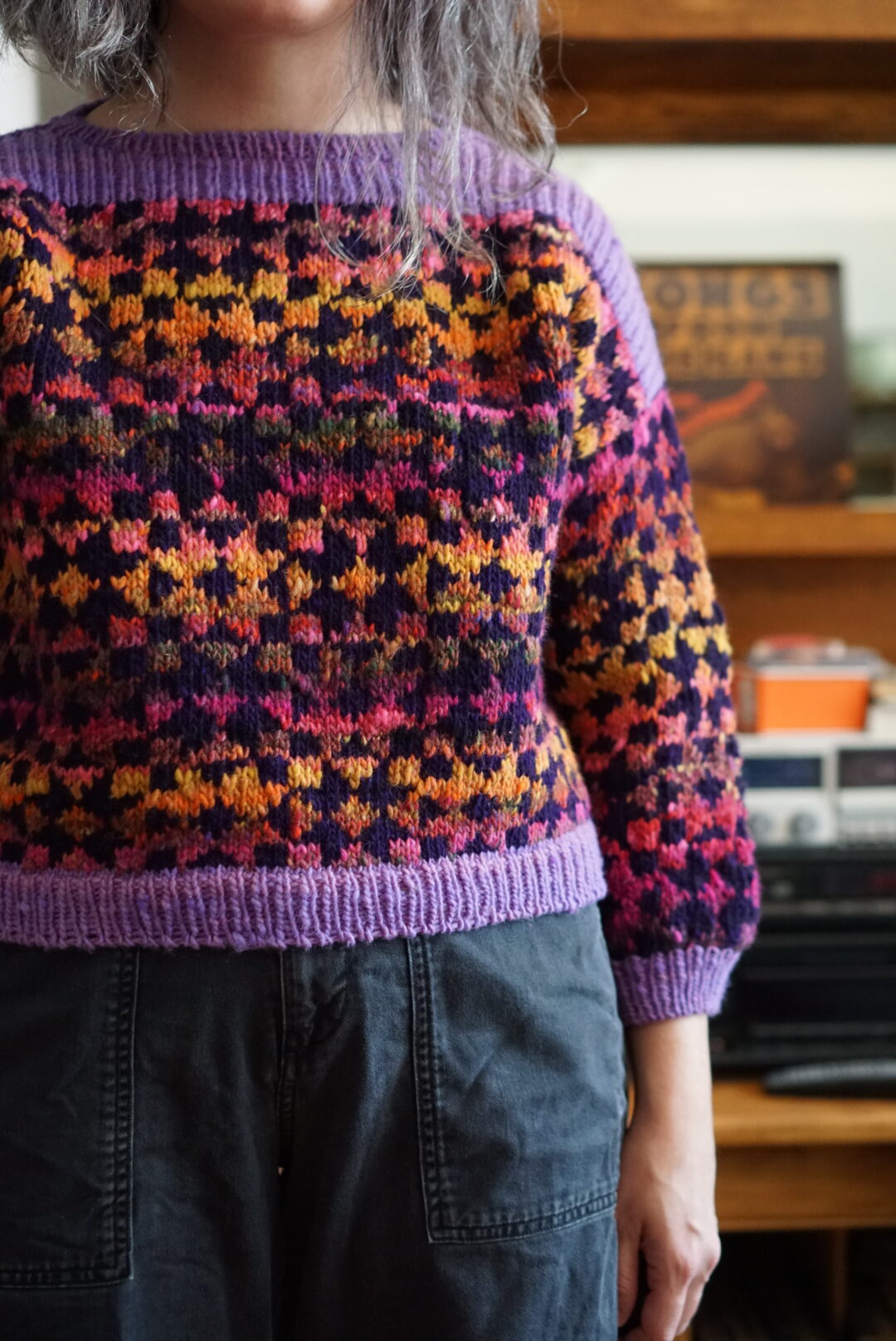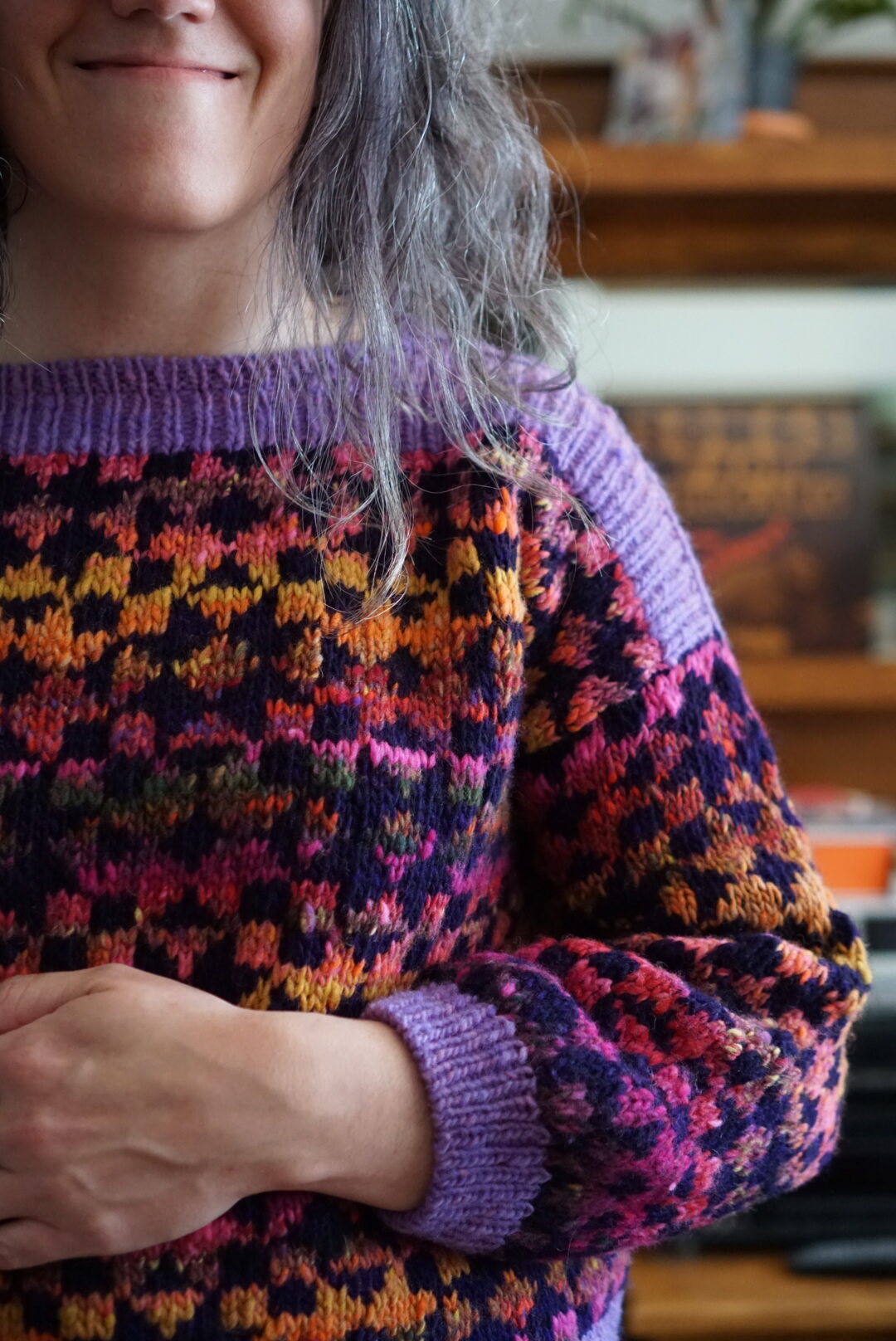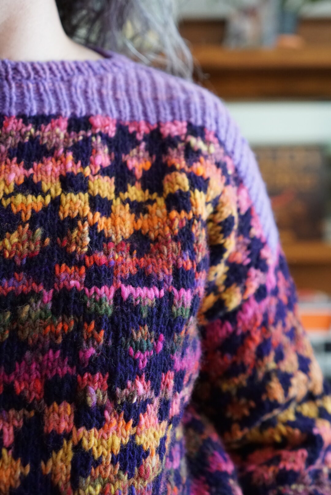In terms of the actual knitting, the Framed sweater is knit bottom up and after you split for the armholes, you have to do colourwork knit flat for a bit. I’d never knit a bottom up sweater, and I’d never done colourwork not in the round, so I got to learn new things. Bottom up sweater make me wary because I have a short torso and prefer my sweaters a bit short in the first place. I usually try sweaters on quite a few times as I’m knitting them in order to make sure I get the perfect length. Not being able to (easily) change the length after the sweater was mostly finished is not my favourite. With this sweater, since it has the colourwork block motif, you’re also limited in how much you can shorten or lengthen it without cutting a block in half horizontally. I ended up just knitting the amount of repeats suggested by the pattern, and it worked out fine! My gauge was a bit off, so I knit size 2 and then it came out as size 3, which is the one I actually wanted in terms of measurements. This is very typical for me, and at this point I’m used to knitting a combo of one size in circumference and another size in length. The three needle bind-off on the shoulders was a new technique to me, and the pattern has you do it with the seam on the outside. I really enjoyed the technique and I like how it looks as an added design detail!