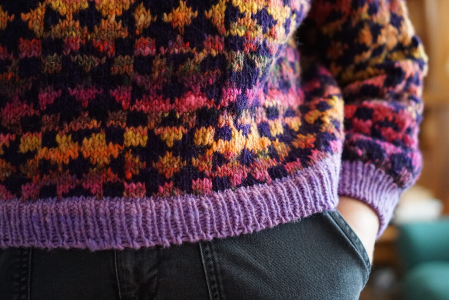 I’d never knit with a slubby yarn before, and it had also been a long time since I’d used a worsted weight. In fact, the last time I used a worsted weight for a sweater (my first colourwork sweater), I didn’t actually like the finished product and a few weeks ago I completely unraveled that project so I could use the yarn for something else. I had completely forgotten how fast it would knit up! And the slubs were very fun to knit with – sometimes the yarn was almost fingering-thin and sometimes it was a fluffy chunky yarn! And I love how the colours look together. All of the research and questing ended up paying off, which is very satisfying.