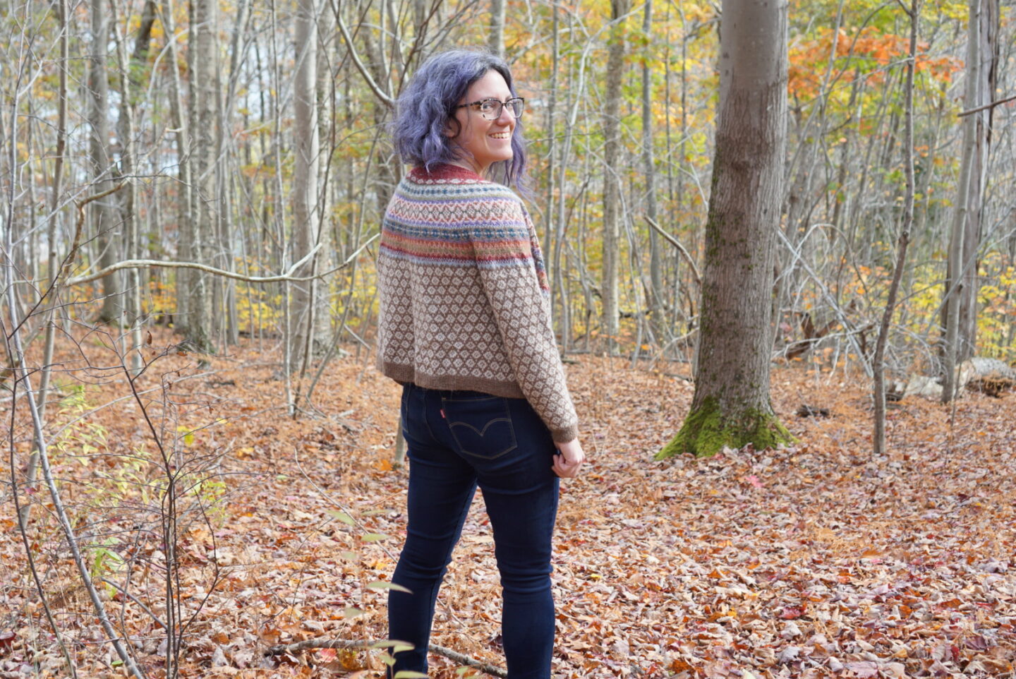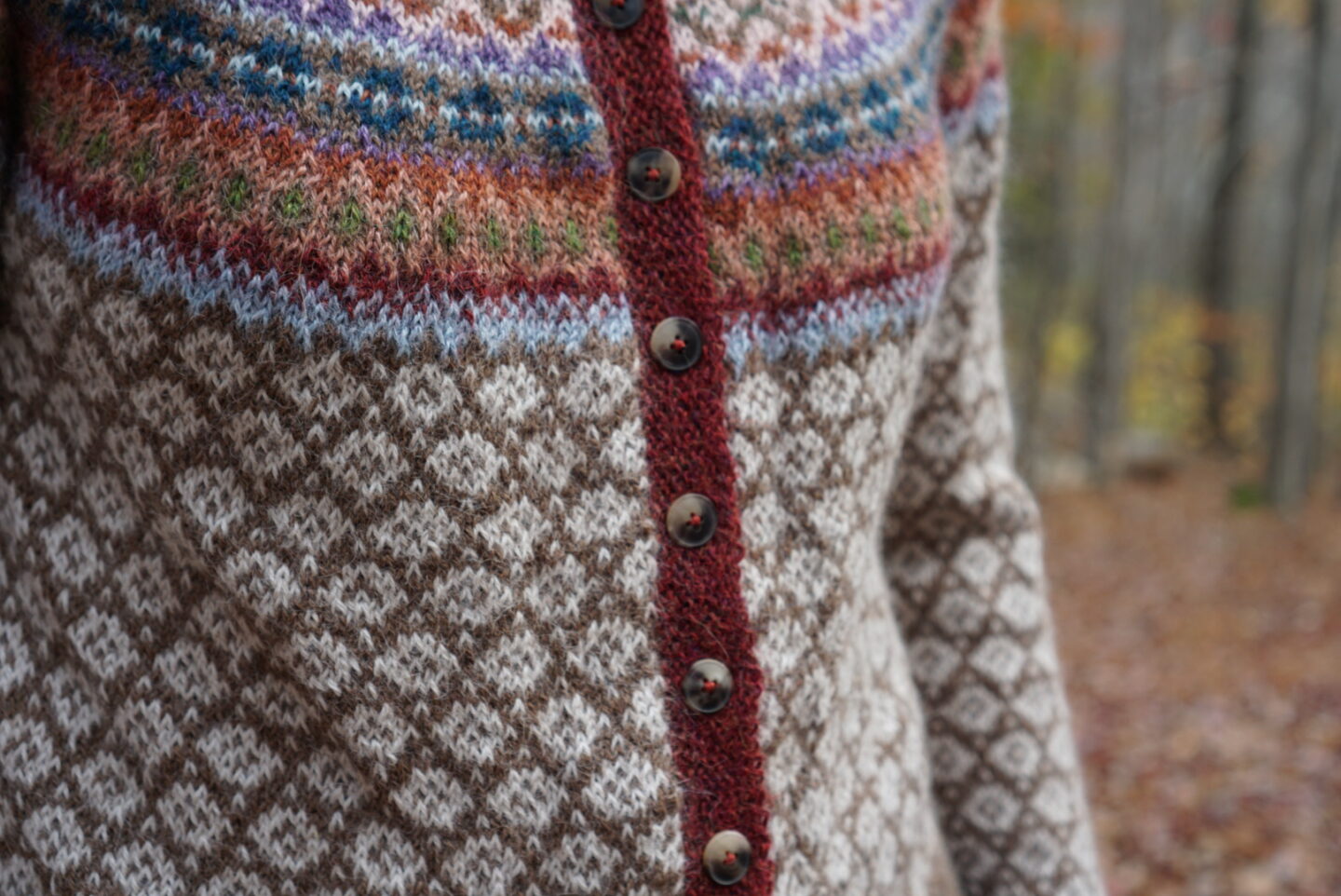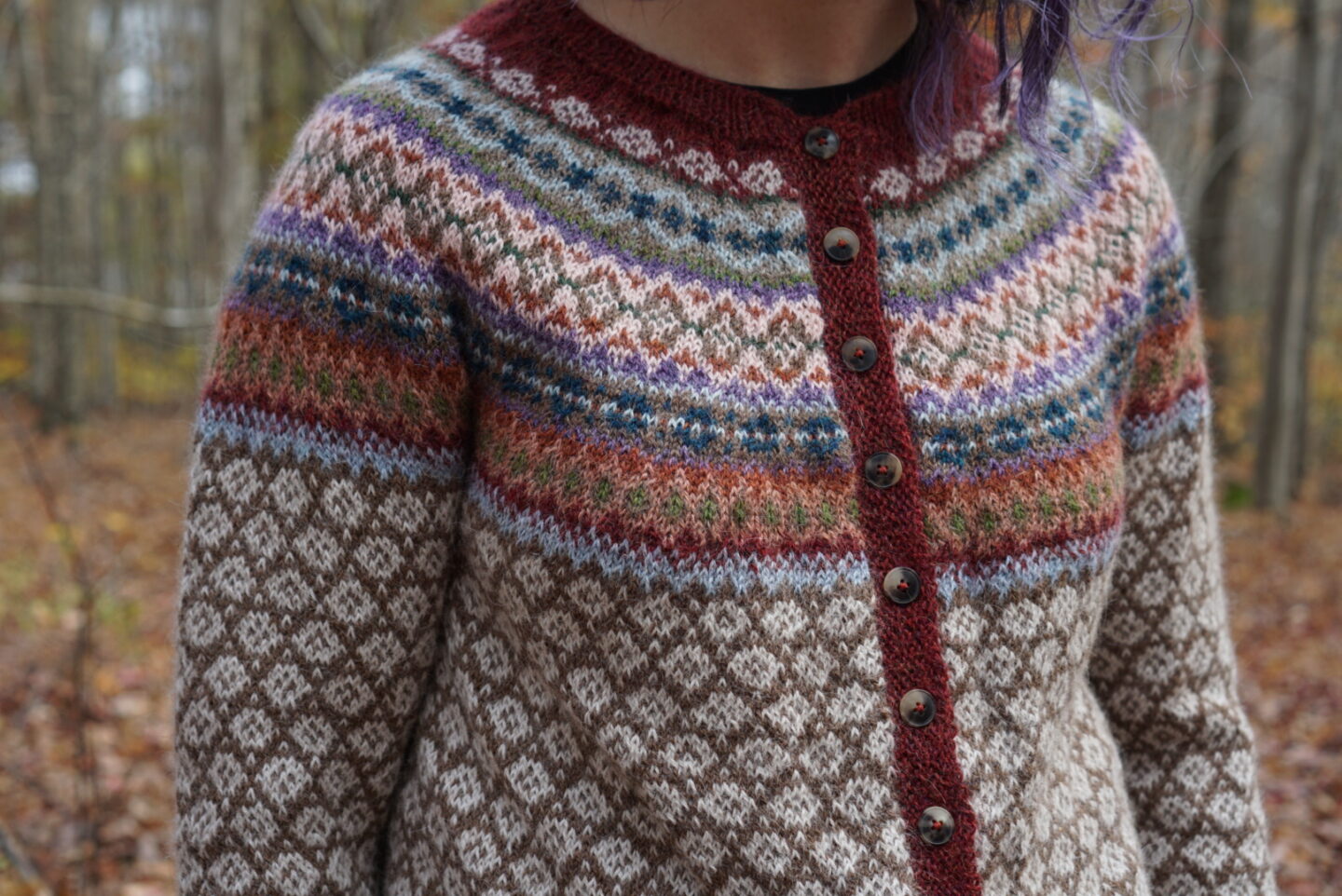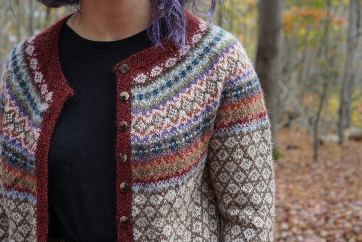 I’m so happy with how it turned out, how it fits, the colours I chose, and the photos themselves! I was motivated to get out and take photos because we are supposed to get a huge amount of rain tomorrow, as well as high winds. I have a feeling that all of the remaining fall leaves are going to get blown off the trees! Since this is such a special project, I was willing to make a journey to the woods to get the fall background colours, and the weather forecast gave me a good push to actually do it. The yarn I used is Drops Alpaca, which is 100% superfine alpaca. I got most of it from Fia Fia, but a few colours I ordered on Etsy. With having to pick so many colours (I’m pretty sure it was 13!) at once, and this project being a special one, I wanted to get exactly the colours I envisioned and not all of them were available in person locally. I used the app ProCreate on my iPad and a screenshot of the colour options from the Drops website in order to test out different colour combinations on the chart for the cardigan. This helped me a lot, especially with being able to test out all of the side-by-side colour combinations that occur throughout the motifs of the design. There’s probably a few combinations that could’ve had better contrast, but overall I’m very happy with how the colours turned out. The yarn itself is very fuzzy and soft! The pattern recommended Rauma Garn for the yarn, and Fia Fia carries that now, so I’m excited to try it out on a future project.