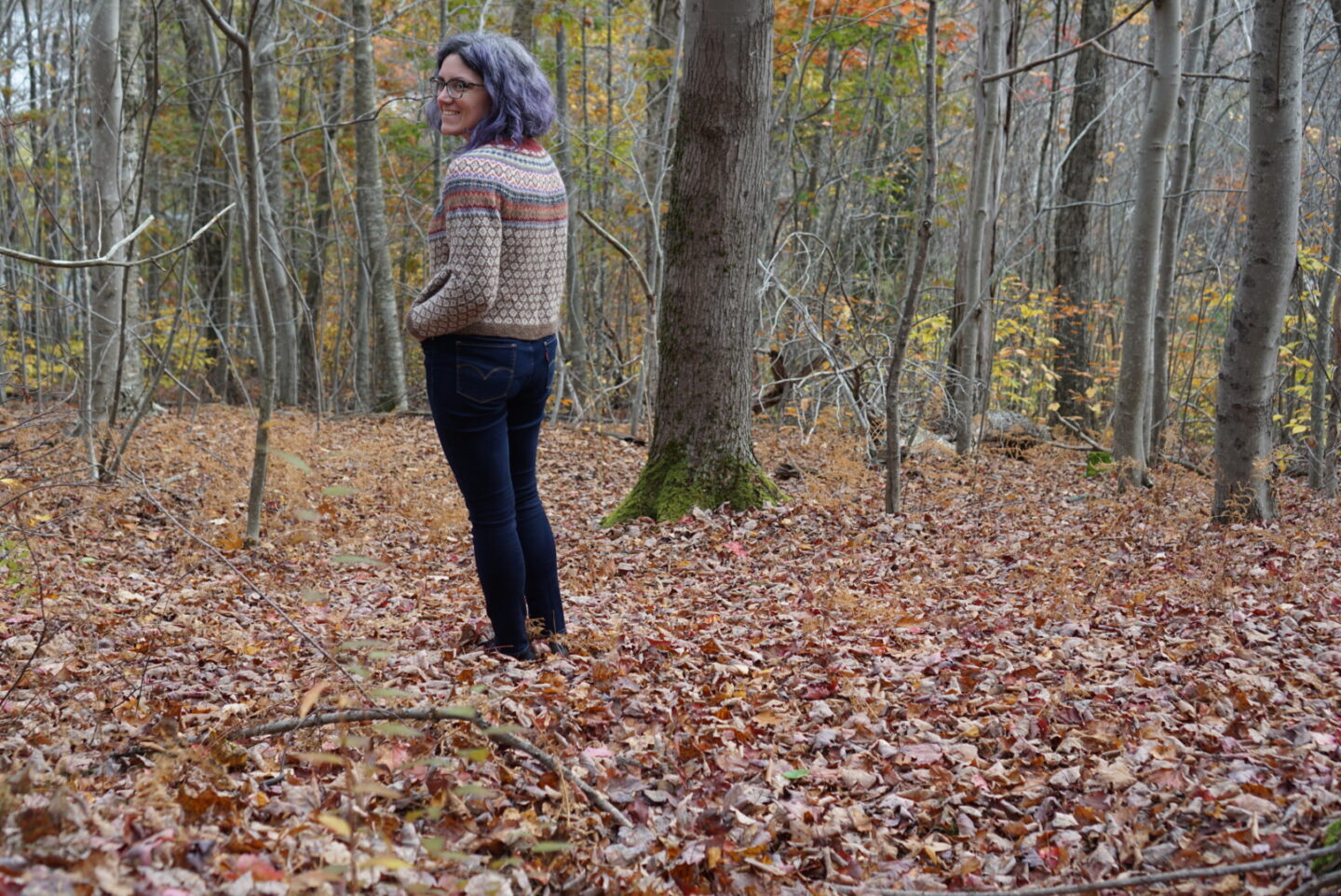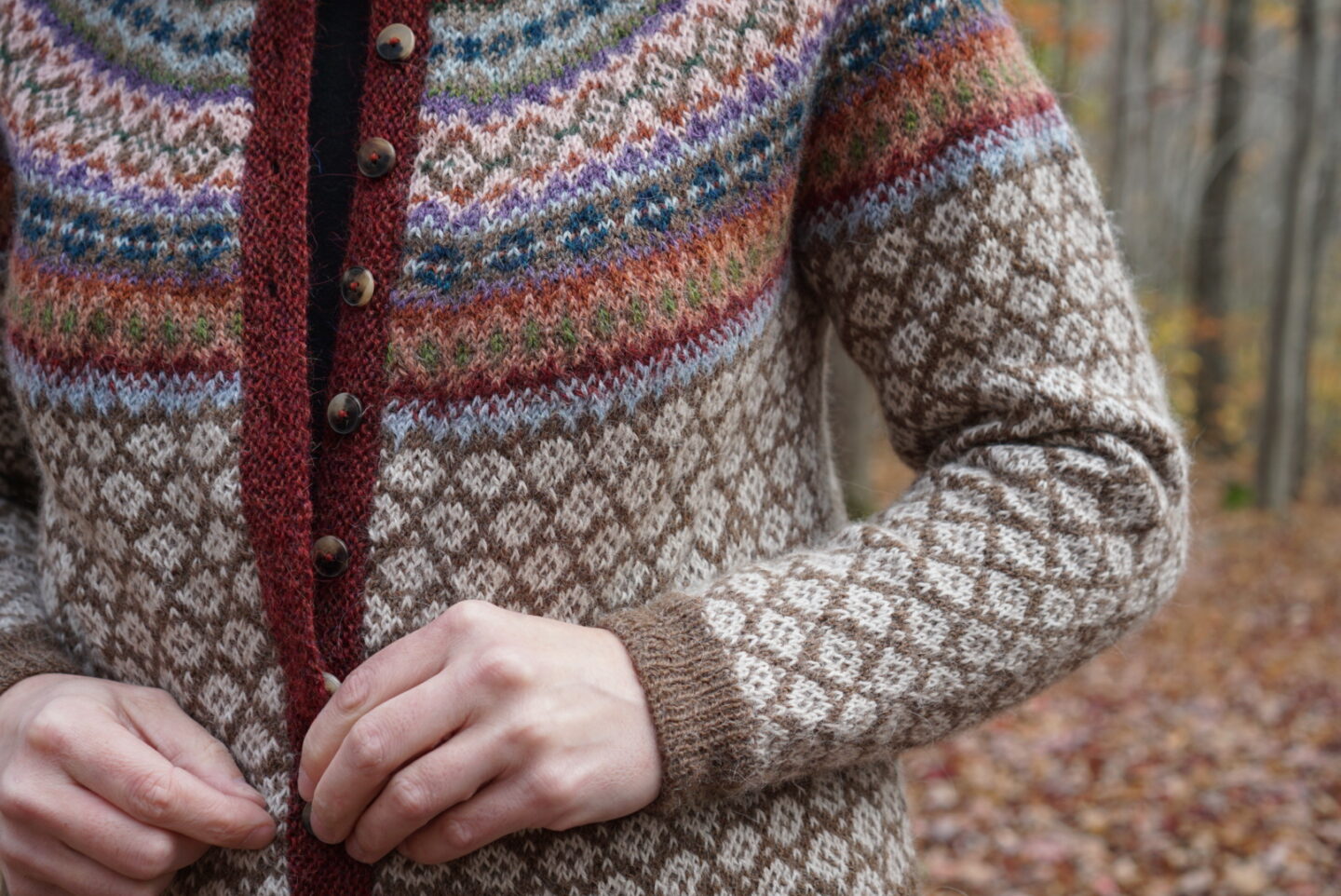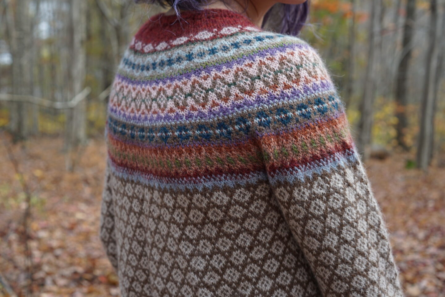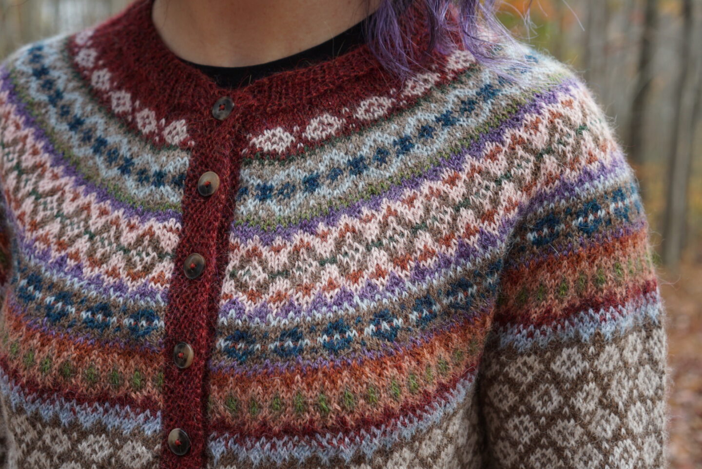 I’m so happy with how it turned out, how it fits, the colours I chose, and the photos themselves! I was motivated to get out and take photos because we are supposed to get a huge amount of rain tomorrow, as well as high winds. I have a feeling that all of the remaining fall leaves are going to get blown off the trees! Since this is such a special project, I was willing to make a journey to the woods to get the fall background colours, and the weather forecast gave me a good push to actually do it. The yarn I used is Drops Alpaca, which is 100% superfine alpaca. I got most of it from Fia Fia, but a few colours I ordered on Etsy. With having to pick so many colours (I’m pretty sure it was 13!) at once, and this project being a special one, I wanted to get exactly the colours I envisioned and not all of them were available in person locally. I used the app ProCreate on my iPad and a screenshot of the colour options from the Drops website in order to test out different colour combinations on the chart for the cardigan. This helped me a lot, especially with being able to test out all of the side-by-side colour combinations that occur throughout the motifs of the design. There’s probably a few combinations that could’ve had better contrast, but overall I’m very happy with how the colours turned out. The yarn itself is very fuzzy and soft! The pattern recommended Rauma Garn for the yarn, and Fia Fia carries that now, so I’m excited to try it out on a future project.