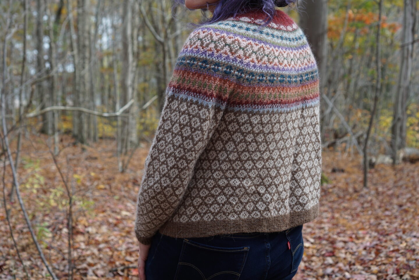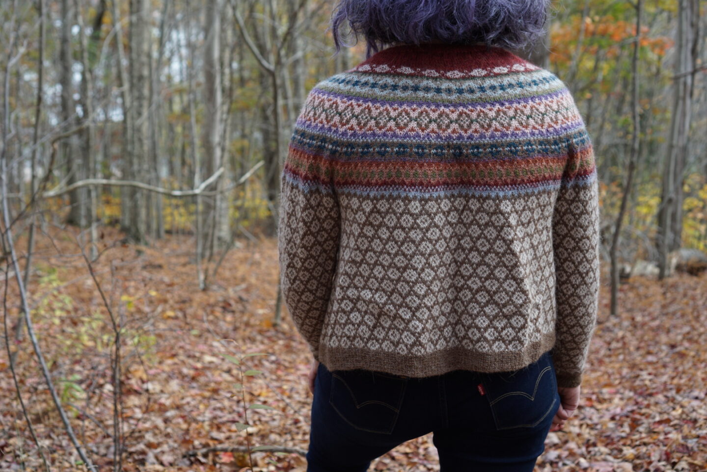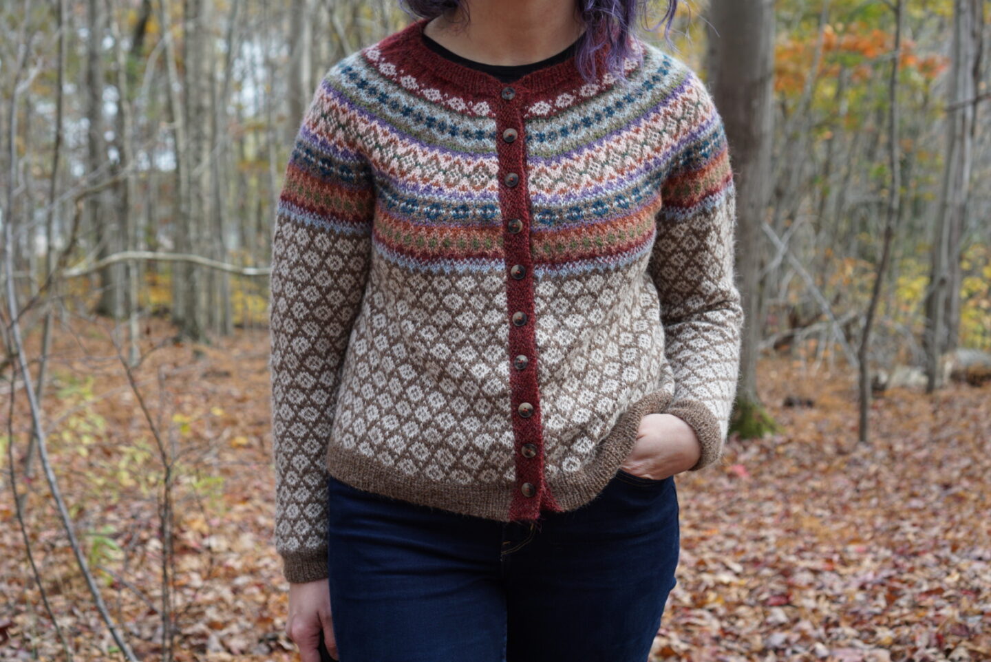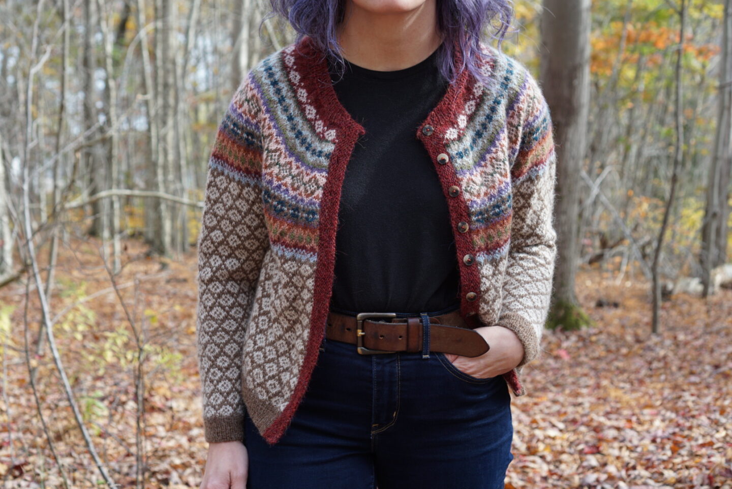 I’m so happy with how it turned out, how it fits, the colours I chose, and the photos themselves! I was motivated to get out and take photos because we are supposed to get a huge amount of rain tomorrow, as well as high winds. I have a feeling that all of the remaining fall leaves are going to get blown off the trees! Since this is such a special project, I was willing to make a journey to the woods to get the fall background colours, and the weather forecast gave me a good push to actually do it. The yarn I used is Drops Alpaca, which is 100% superfine alpaca. I got most of it from Fia Fia, but a few colours I ordered on Etsy. With having to pick so many colours (I’m pretty sure it was 13!) at once, and this project being a special one, I wanted to get exactly the colours I envisioned and not all of them were available in person locally. I used the app ProCreate on my iPad and a screenshot of the colour options from the Drops website in order to test out different colour combinations on the chart for the cardigan. This helped me a lot, especially with being able to test out all of the side-by-side colour combinations that occur throughout the motifs of the design. There’s probably a few combinations that could’ve had better contrast, but overall I’m very happy with how the colours turned out. The yarn itself is very fuzzy and soft! The pattern recommended Rauma Garn for the yarn, and Fia Fia carries that now, so I’m excited to try it out on a future project.