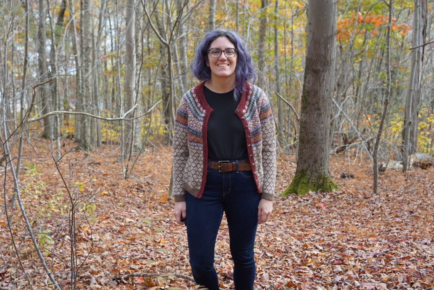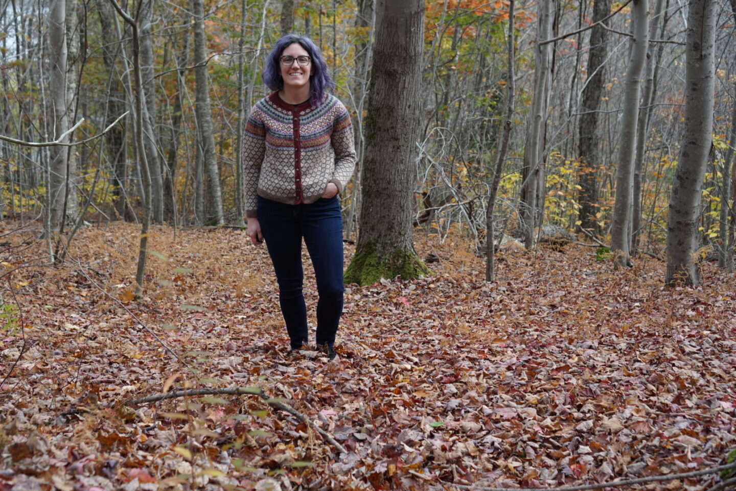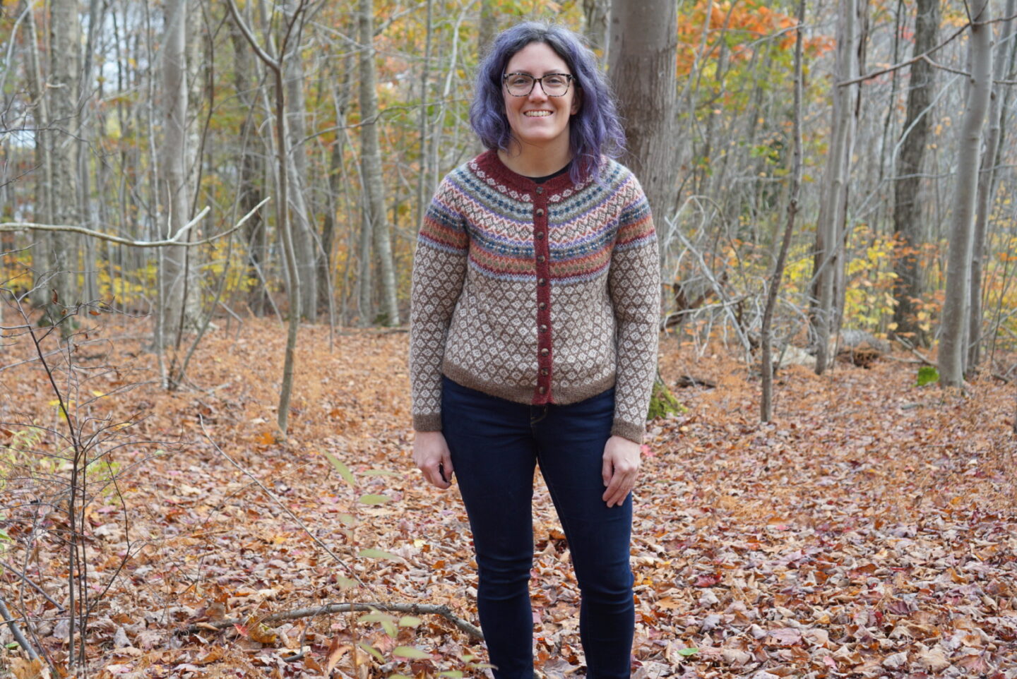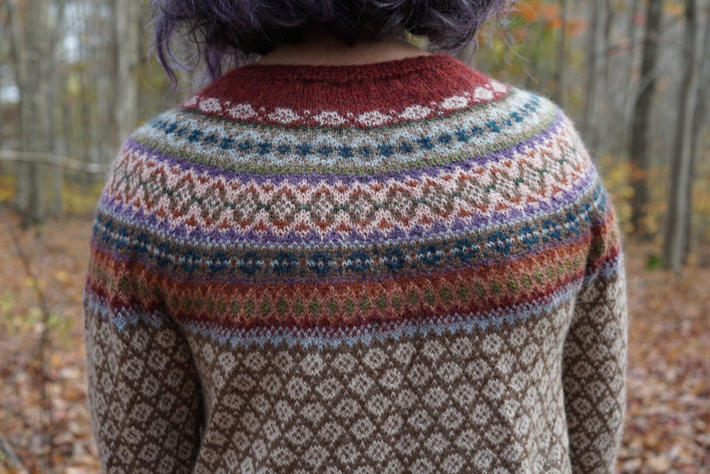 I’m so happy with how it turned out, how it fits, the colours I chose, and the photos themselves! I was motivated to get out and take photos because we are supposed to get a huge amount of rain tomorrow, as well as high winds. I have a feeling that all of the remaining fall leaves are going to get blown off the trees! Since this is such a special project, I was willing to make a journey to the woods to get the fall background colours, and the weather forecast gave me a good push to actually do it. The yarn I used is Drops Alpaca, which is 100% superfine alpaca. I got most of it from Fia Fia, but a few colours I ordered on Etsy. With having to pick so many colours (I’m pretty sure it was 13!) at once, and this project being a special one, I wanted to get exactly the colours I envisioned and not all of them were available in person locally. I used the app ProCreate on my iPad and a screenshot of the colour options from the Drops website in order to test out different colour combinations on the chart for the cardigan. This helped me a lot, especially with being able to test out all of the side-by-side colour combinations that occur throughout the motifs of the design. There’s probably a few combinations that could’ve had better contrast, but overall I’m very happy with how the colours turned out. The yarn itself is very fuzzy and soft! The pattern recommended Rauma Garn for the yarn, and Fia Fia carries that now, so I’m excited to try it out on a future project.