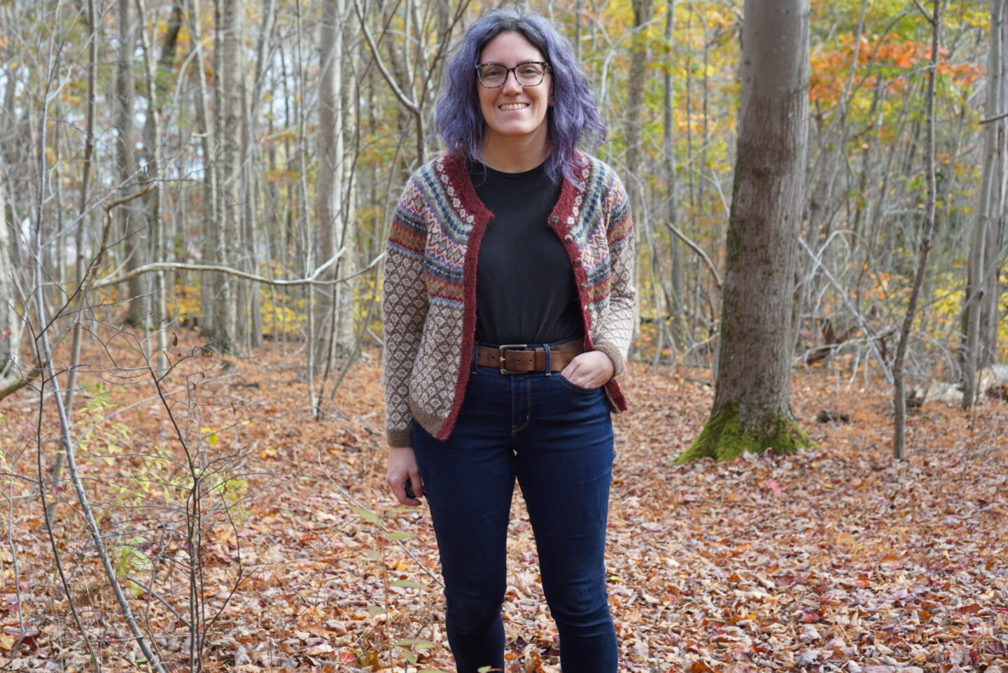 I cast on this project in January of this year as part of the Bucket List Knit-Along hosted by Tim and Mckenzie on their Sibling Energy podcast! If you haven’t watched their podcast (yes, watched, because if you didn’t know already, a quirk of the knitting community is that knitting YouTube channels are usually referred to as podcasts), I highly recommend it! It is a delight! The Bucket List KAL was very open-ended in terms of projects. Anyone who was participating just needed to pick a project that was something that felt suited the spirit of a “bucket list” project – something you’d been putting off because it was too expensive, too intimidating, too complicated, etc. I picked this project for a few reasons. I’d never done an all-over colourwork project, and really wanted to give it a try. I’d never had to pick so many colours for a project at the same time. I’d never done Fair Isle knitting – I’d done stranded colourwork but nothing that was made up of shorter recurring motifs with short floats. I’d also never steeked. Steeking is when you CUT your knitting in order to make an opening. It’s very common in colourwork/Fair Isle knitting since those projects are traditionally knit in the round, and then you would need to create an opening to turn it into a cardigan, or in some instances to create armholes. I’ll talk more about that later on in this post. For now, here are some photos of the finished cardigan!