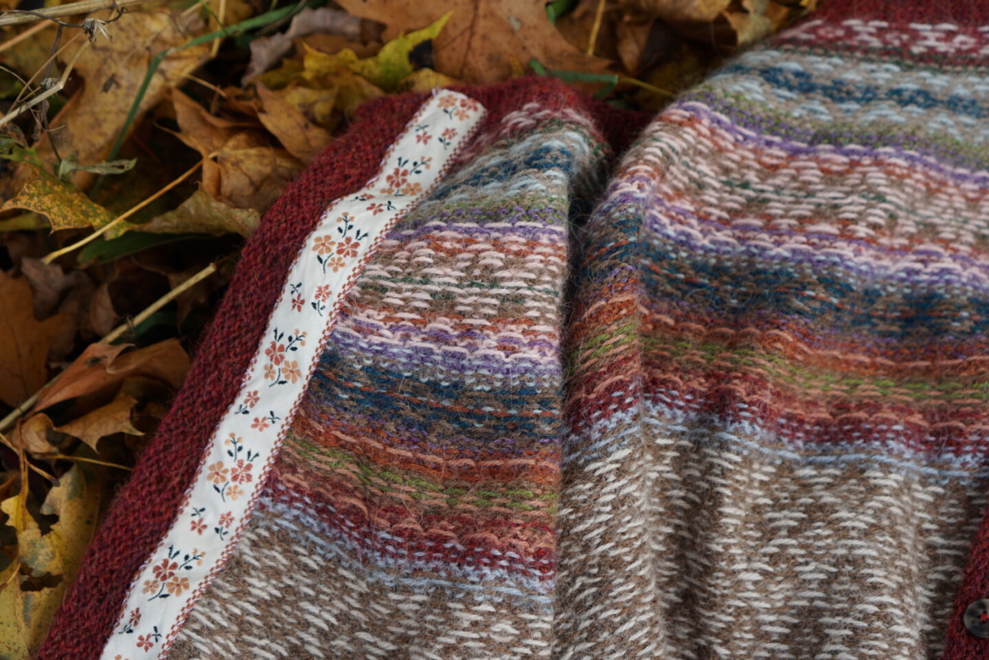 Once I did the steek, I picked up and knit the button bands on either side using garter stitch and one-stitch button holes. This went so quickly! I got slowed down by the bind-off because nothing was stretchy enough and kept making it really puckered. I think I tried four different times. I don’t even remember what method I ultimately used that worked, but I’m happy with it in the end. I sewed the buttons on with sewing thread, because I didn’t have any needles that were simultaneously big enough to fit the yarn through the eye but small enough to fit through the holes in the buttons. I got these horn buttons from Fia Fia. They really fit my vision! In my best friend’s house growing up, there was a cardigan very similar to this one that hung on the back of an office chair in their basement. I never saw anyone wear it, but I was really inspired by it when making this one in terms of colours and the buttons. As you can see below, the raw edge of the steek gets enclosed with a cute ribbon! I got this ribbon on Etsy, and found it by searching for “steeking ribbon”. It’s a woven ribbon with a floral motif, and I hand-sewed it in place on each side of the opening. Having that there and not being able to see the raw edges of where I cut the knitting has really helped me feel more confident that my cardigan isn’t going to suddenly unravel without warning, even though the ribbon isn’t actually doing anything structural to prevent that.